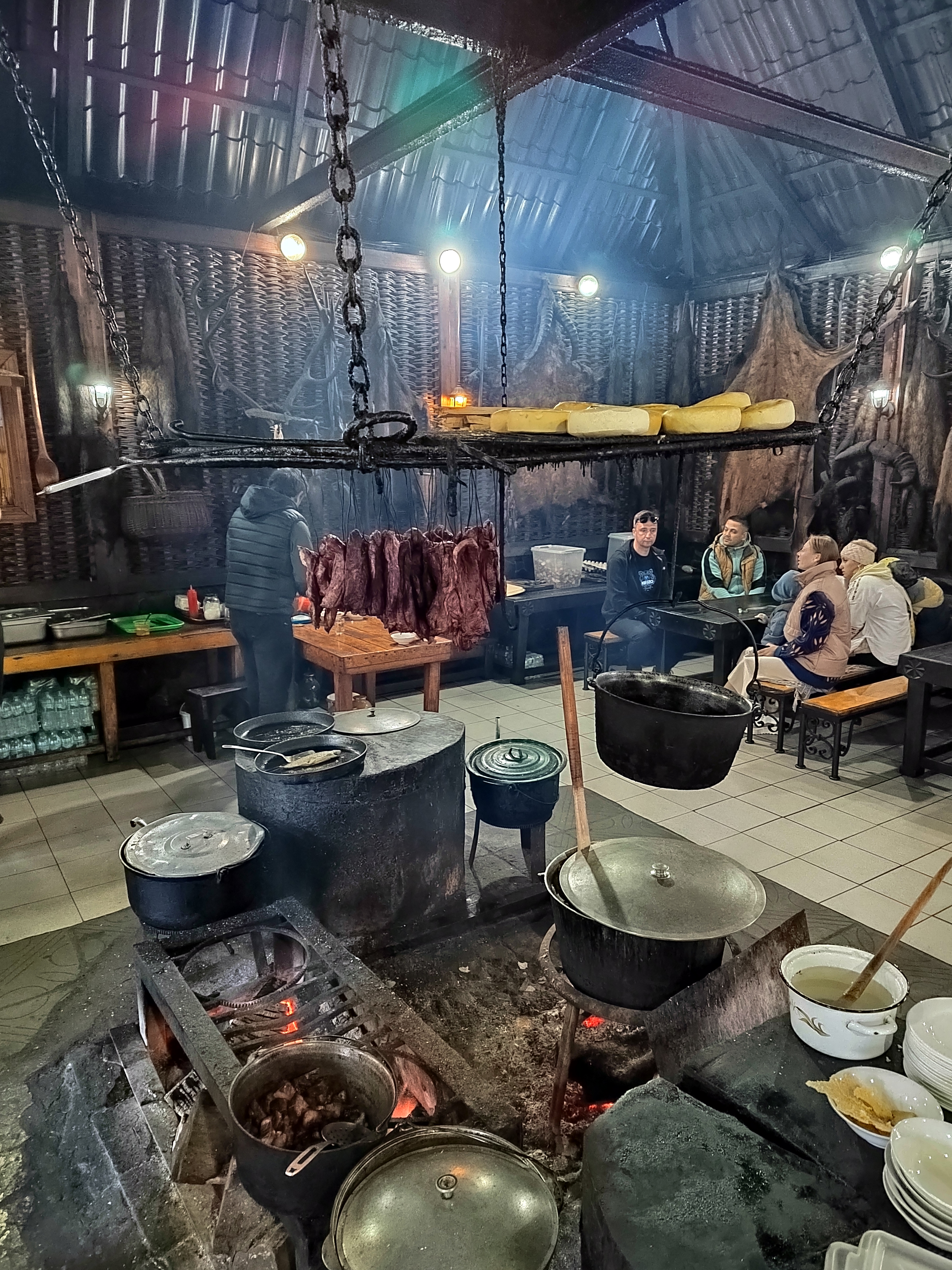 А мы проголодались,зашли в кафе. В центре огонь, где готовятся блюда, выше вялится мясо, а еще выше, на железной сетке сыр коптится. Сыр у них ребята - это прощай фигура!! Я, конечно, свою не удержала.