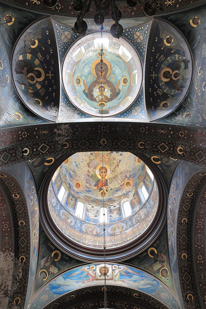 В храме запрещена фотосъемка, я взяла фото из интернета. Мне очень понравилось внутреннее убранство. Там нет икон в богатых массивных рамках. Исключительно фрески. НО краски яркие, хотя тоже нужда в реставрации.