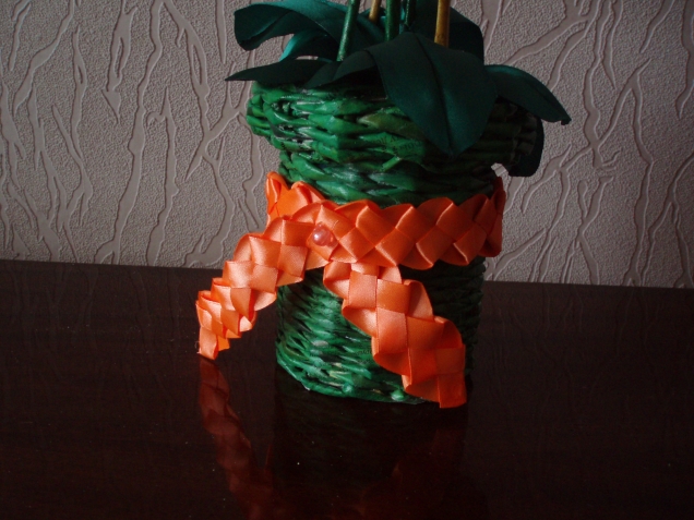 Вот закончила сегодня деревце топиарий-орхидея из атласных лент, горшочек сплетен из газетных трубочек. Выношу на суд мастериц, принимаю любую критику