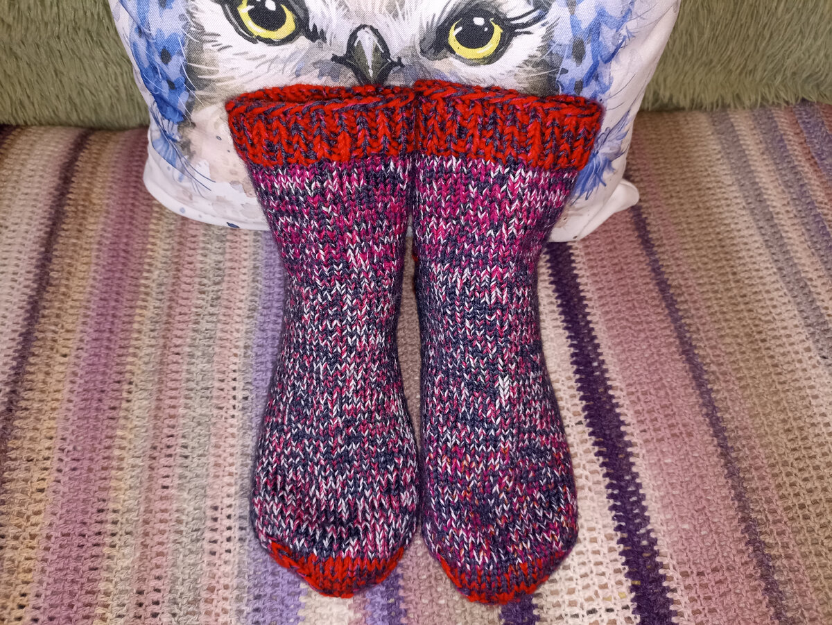 Мама хотела красные носочки для дома. Но красной пряжи было совсем мало, поэтому комбинировала имеющиеся нитки и получились такие носочки.