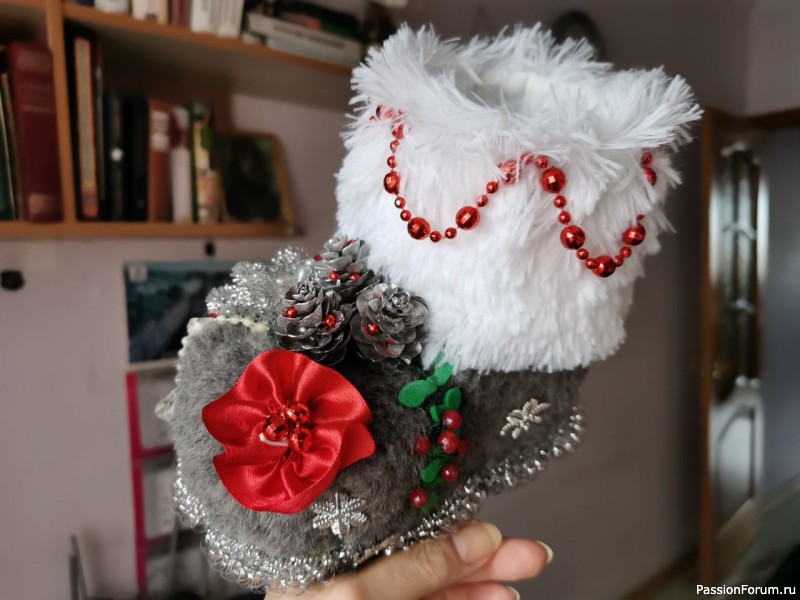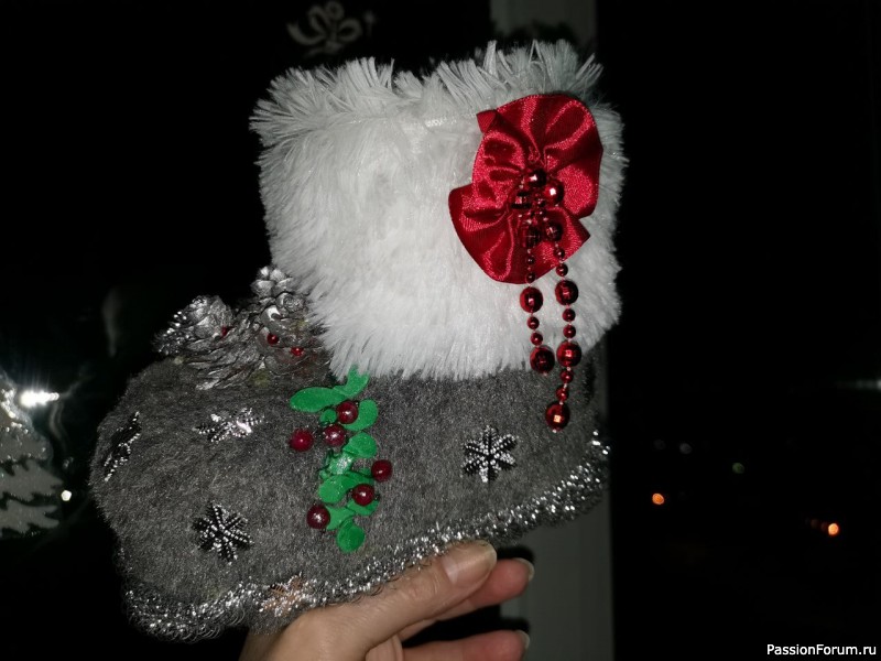 ), пришлось время лишнее потратить, пока вторая пара просохнет. Согласна с зайчишкой, думала делать по своему(как предыдущих, с некоторыми изменениями), ну теперь может быть к старому-Новому году(если ни чего не помешает). А вот про валенок....., не знаю. Племянница тоже сказала, что он невзрачный, а я его планировала в таких тоннах, только мне не хватает зелени, хвойных веточек, а их продают только в композиции(то есть с ценой за работу, жирновато