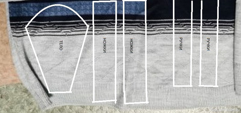 Про сапог я написала ниже. А зайку, если есть желание, переделай! Его не обязательно вязать, можно так же выкроить туловище, ножки и ручки из остатков того же свитера. Если не планируешь из свитера делать еще что-то, то можно было бы все детальки выкроить двуцветными: верх серый, а низ цветной, вот примерно так