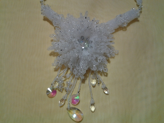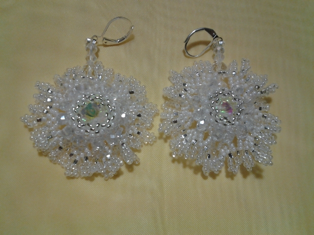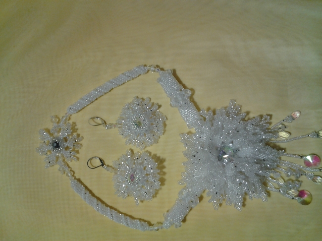 Где-то около года назад случайно нашла в интернете очень красивый свадебный комплект от Натальи Кузьмы "Хризантема". Долго искала МК,но увы....И вот опять таки совершенно случайно наткнулась на тот же комплект и даже на МК.Сразу же взялась за дело и вот результат.Единственно,что в оригинале ещё есть и браслет,но мне почему-то подумалось,что это уже лишнее.