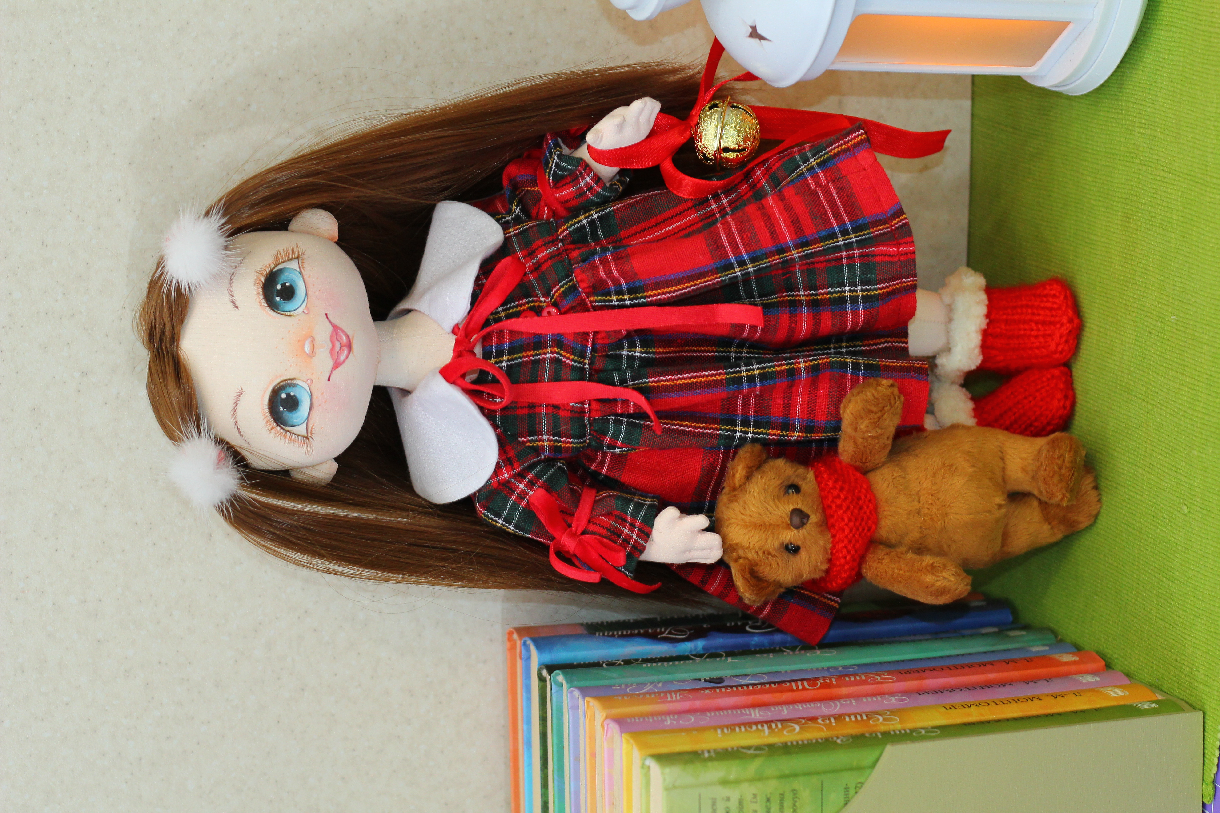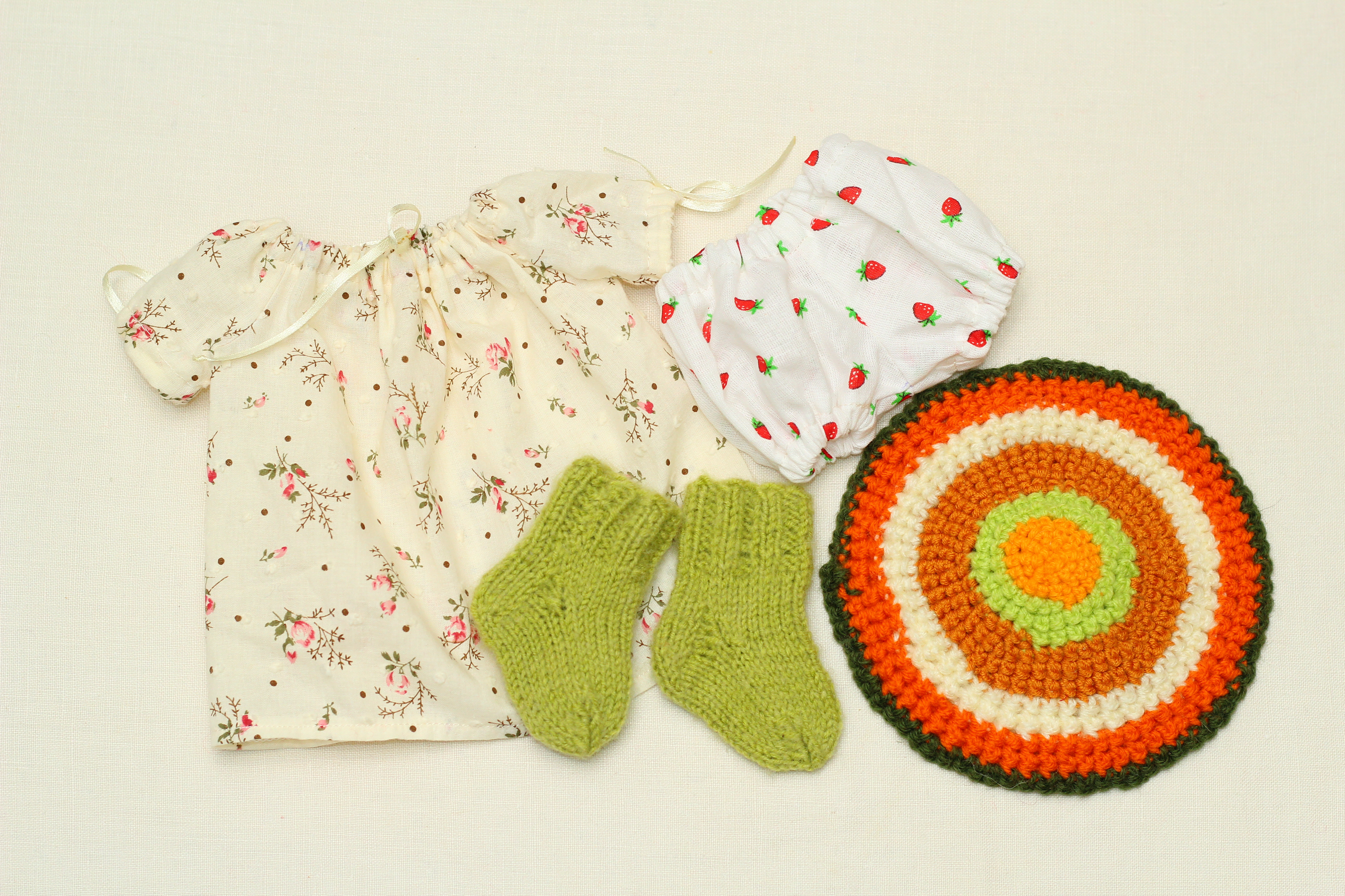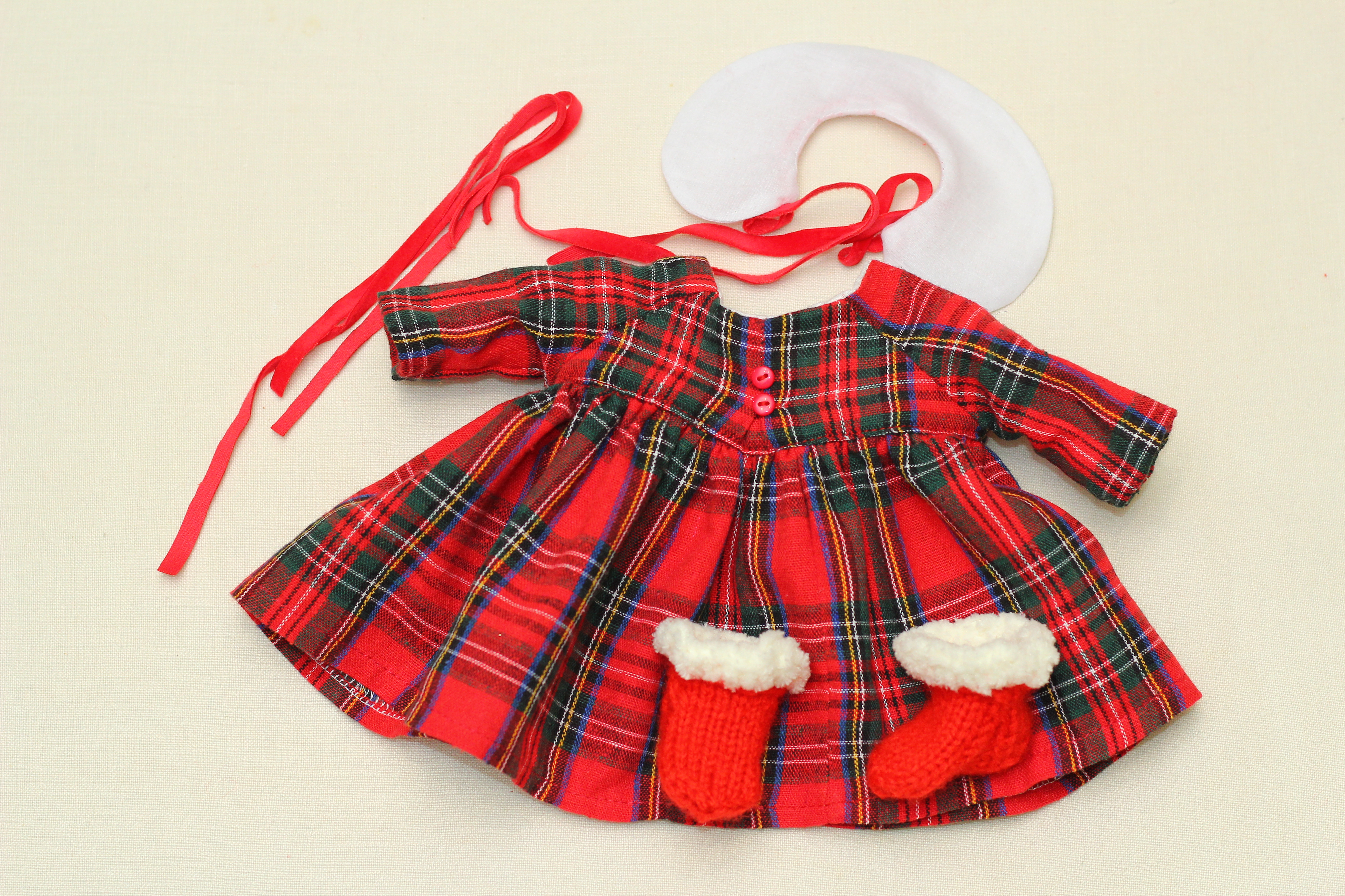 Теплое вязаное пальтишко, Шапочка, Брючки, Ботинки, Мишка, Бубенчик, Сорочка .Панталончики, Носочки вязаные зеленые, Коврик вязаный, Платье красное в клеточку, Воротничок, Носочки красные вязаные, Штанишки вязаные , Мишка с шарфиком.