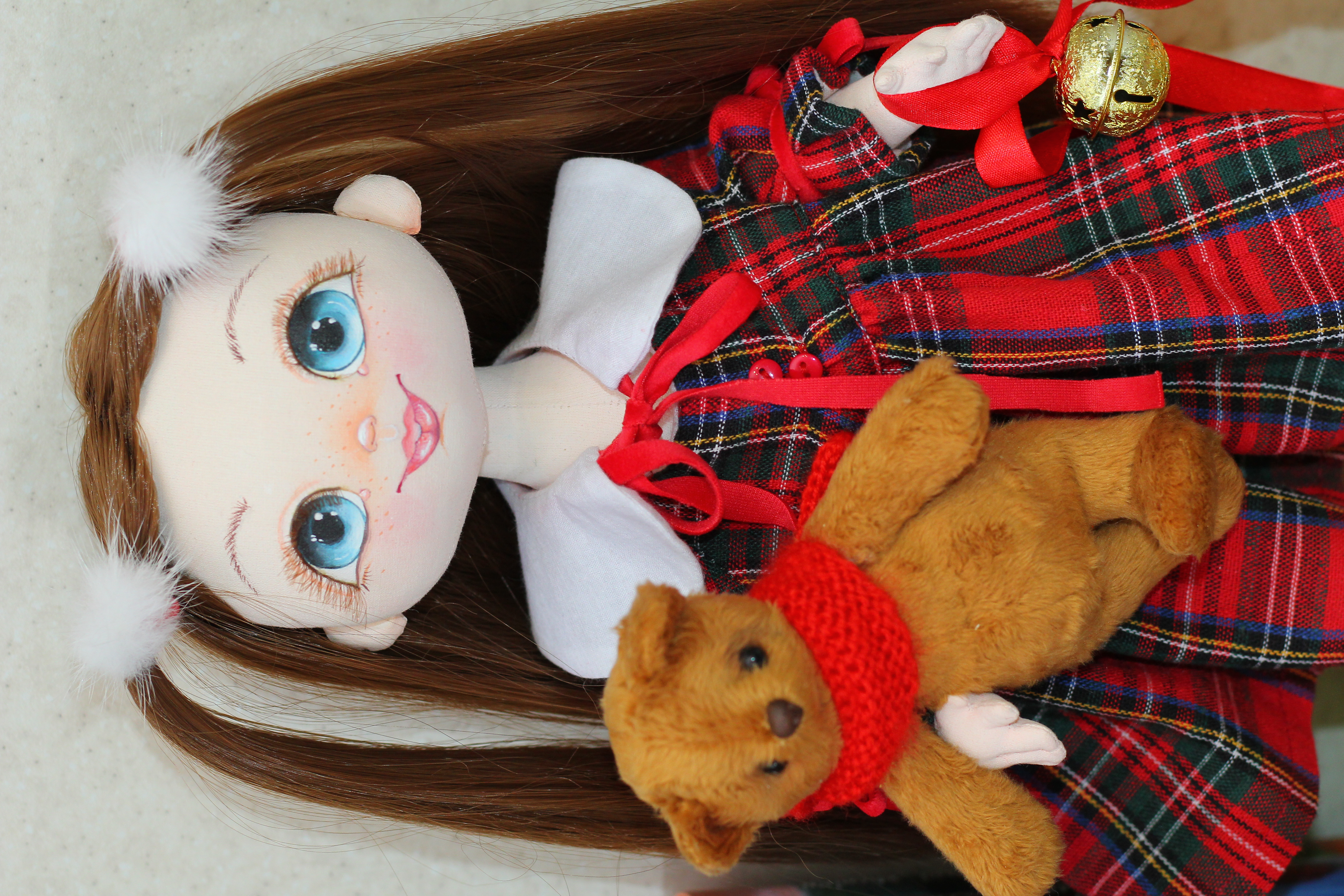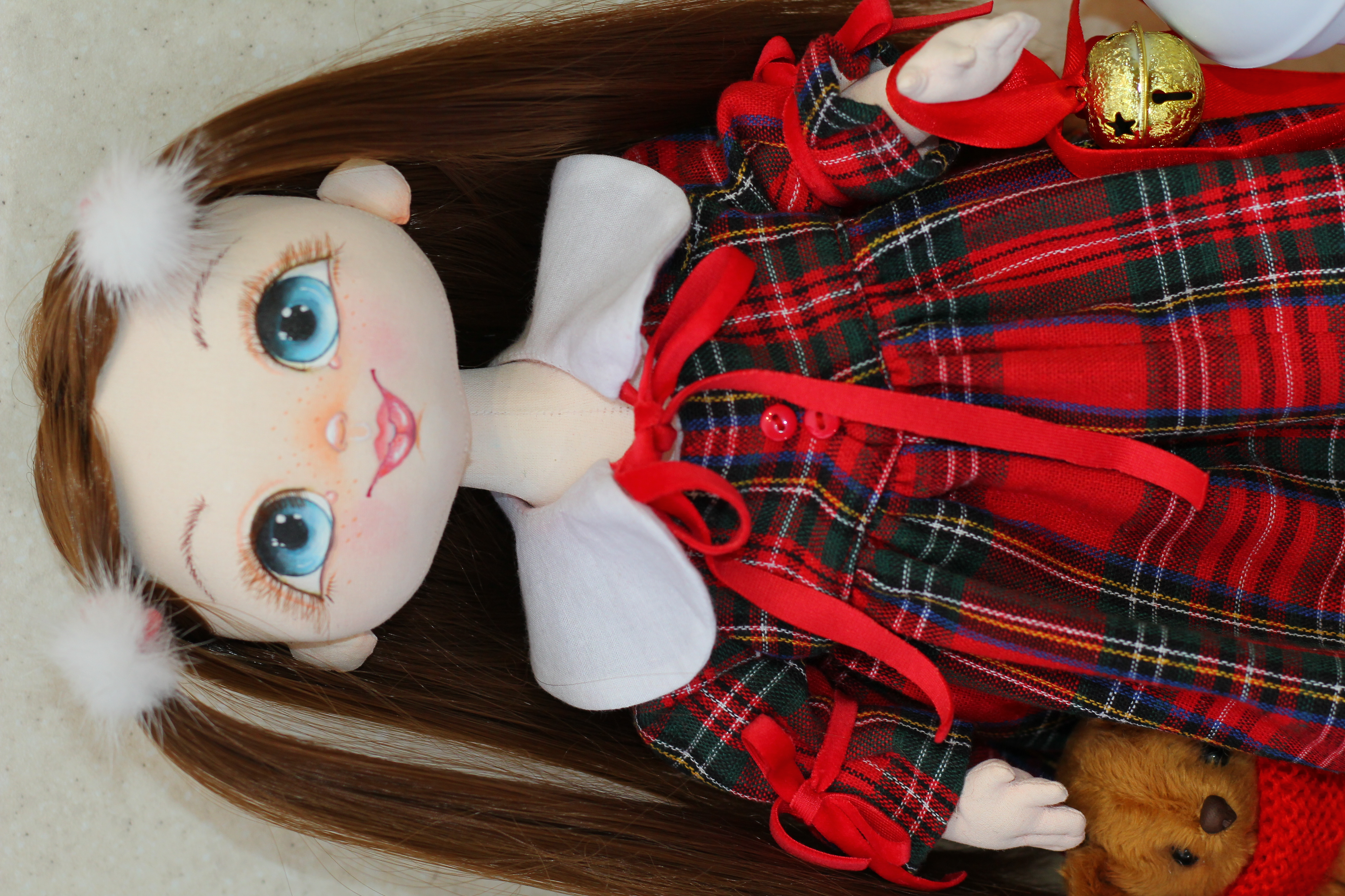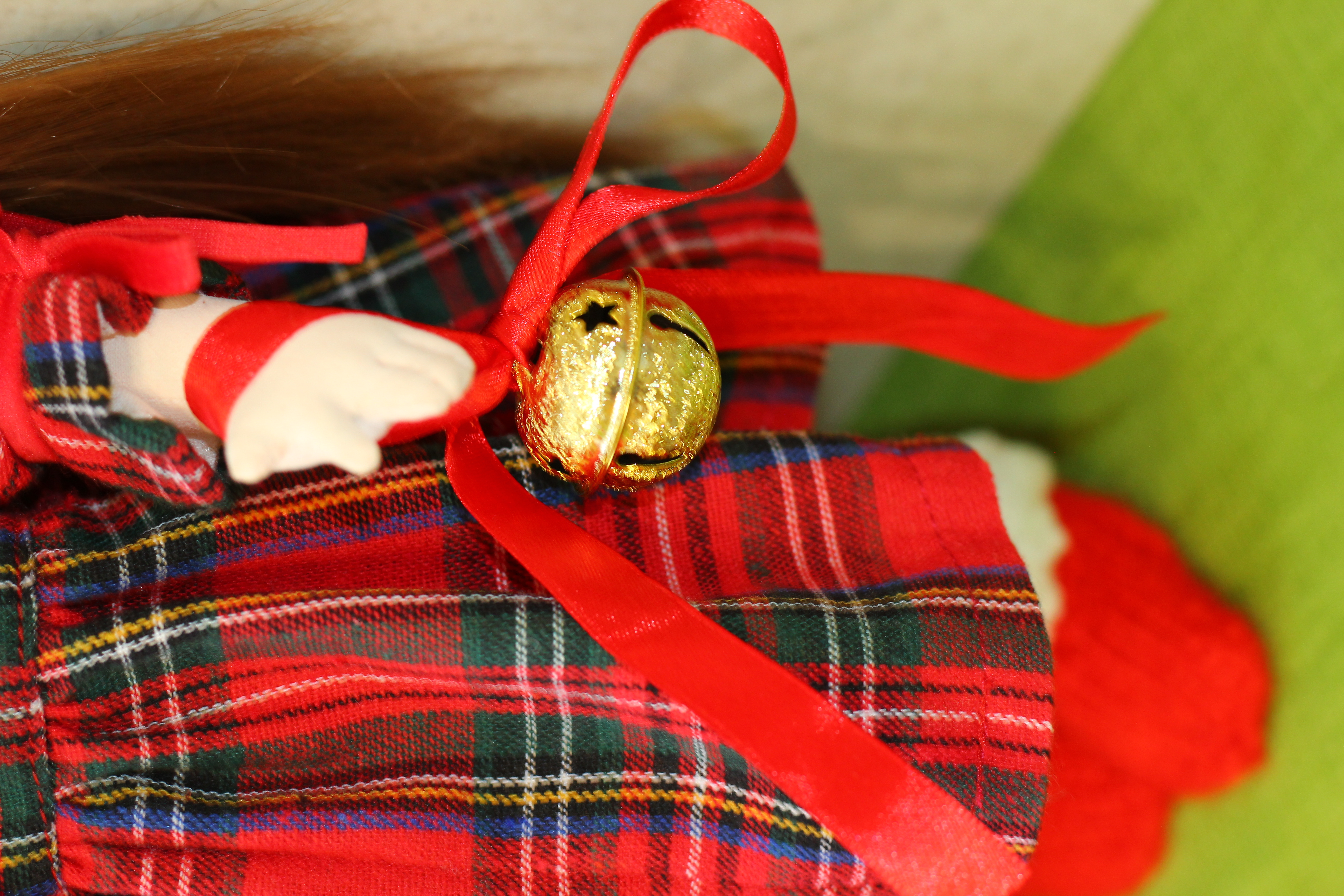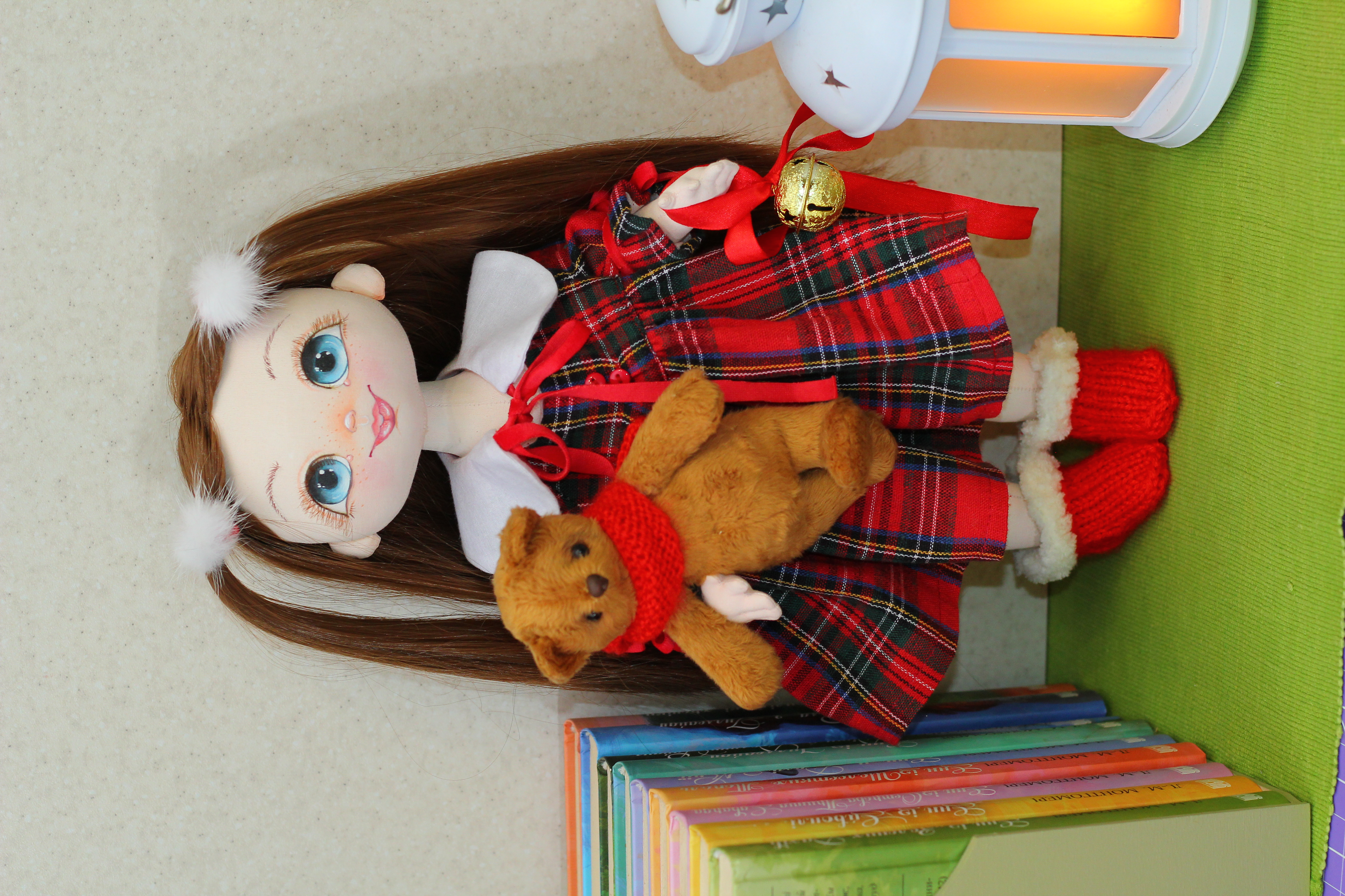 Теплое вязаное пальтишко, Шапочка, Брючки, Ботинки, Мишка, Бубенчик, Сорочка .Панталончики, Носочки вязаные зеленые, Коврик вязаный, Платье красное в клеточку, Воротничок, Носочки красные вязаные, Штанишки вязаные , Мишка с шарфиком.