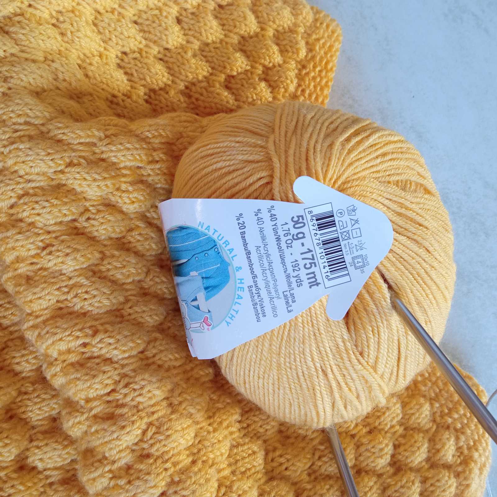 Плед для новорожденного. Цвет выбирала солнечный, поскольку в Санкт Петербурге осенью и зимой погода чаще всего не радует, сумрак постоянный. Выбор пал на пряжу бэби вул от ализе, понравился состав, яркий цвет и аннотация к пряже на сайте:
