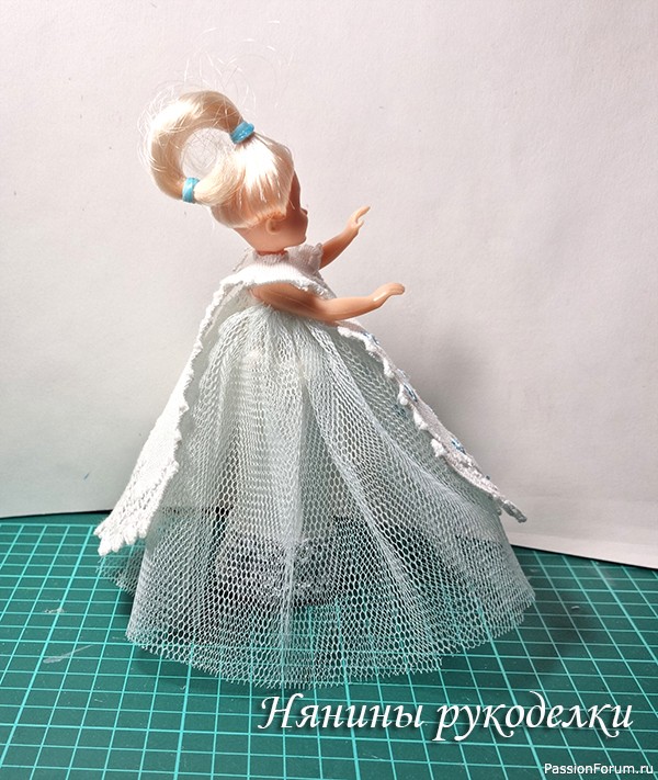 Теперь можно делать фатиновую юбочку. Сделала юбочку. Сняла голову кукле, натянула вышитое платьице. Впереди, сзади красота!