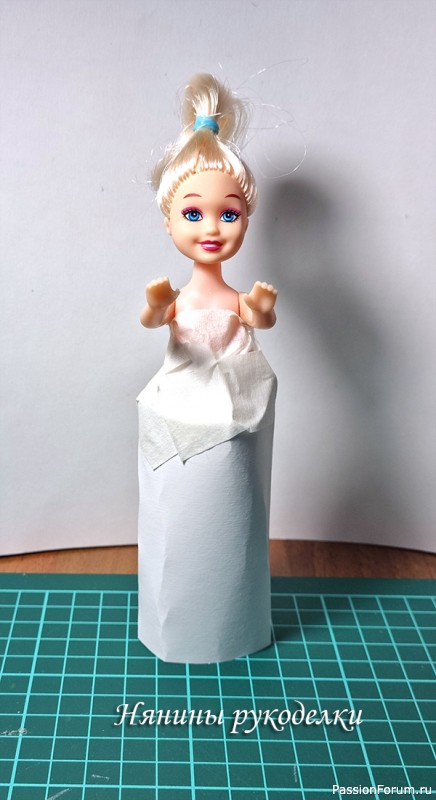 Значит, будем удлиняться). Но сначала на помывку. При помывке и при последующем расчесывании кукла потеряла еще волосы и полысела еще больше( Я знала, что перепрошивать не буду, про подклеивание даже не думала ( чего там клеить), да и при снятии головы обнаружилось, что то место на шее, которым она заходит в голову (не знаю как объяснить) уже имеет трещину. Поэтому лишний раз снять голову туда-сюда не получится. Поэтому я зачесала ставшие блестящими после помывки волосы наверх, собрала резинкой и так оставила. А занялась удлинением тела. Из обычной альбомной бумаги для рисования я свернула подобие конуса и при помощи малярного скотча закрепила под грудью куклы, приложила платьице. По длине все хорошо.