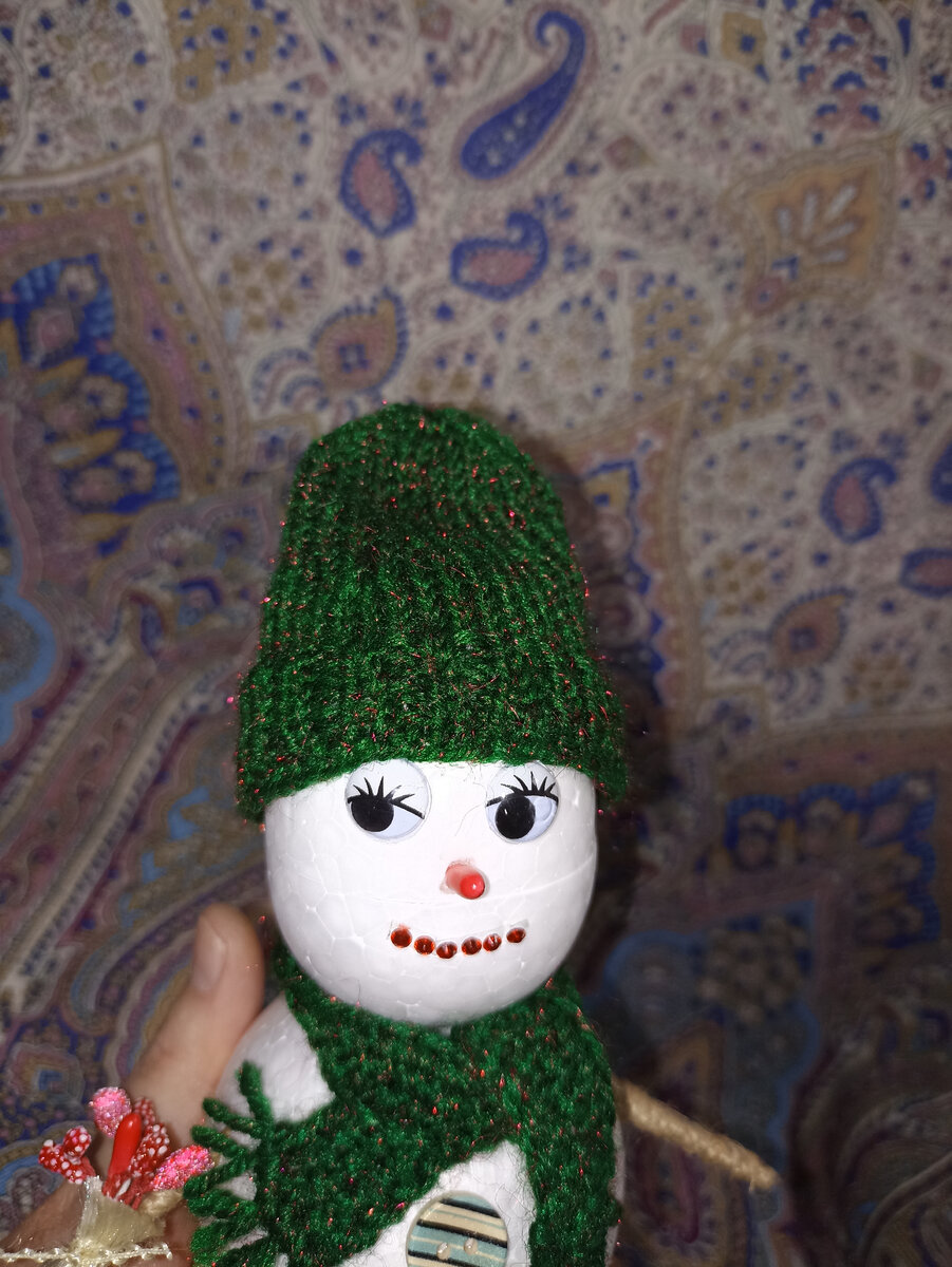 Снеговик молодой, вчера сотворился, сегодня нарядился. Расскажу, как это произошло: пришла я вечером с работы домой, порылась в рукодельных материалах, вытащила на стол пенопластовые шары, пряжу, пуговицы, глазки для куколок и другое. Хотела испробовать в работе новый клеевой пистолет, но не судьба - вилка не такая (с плоскими штырями), нужно покупать переходник. Пришлось пользоваться где-то клеем Момент прозрачным, где-то двусторонним прозрачным скотчем. Вы, пожалуйста, Моментом не пользуйтесь, так как он разъедает пенопласт на раз-два (видите - носик провалился?) Нужен клеевой пистолет и точка.