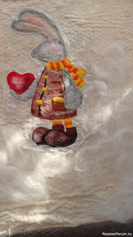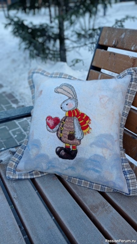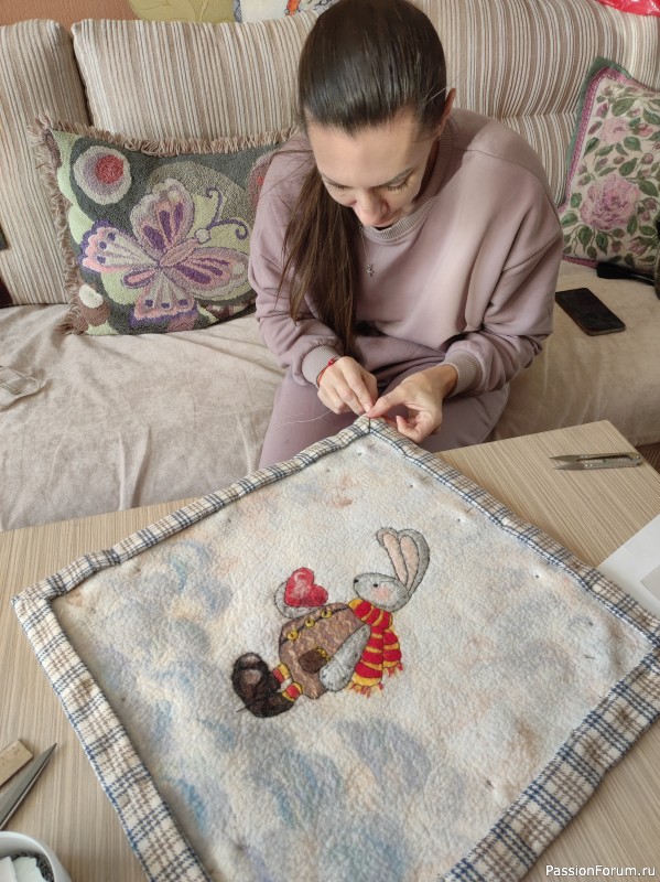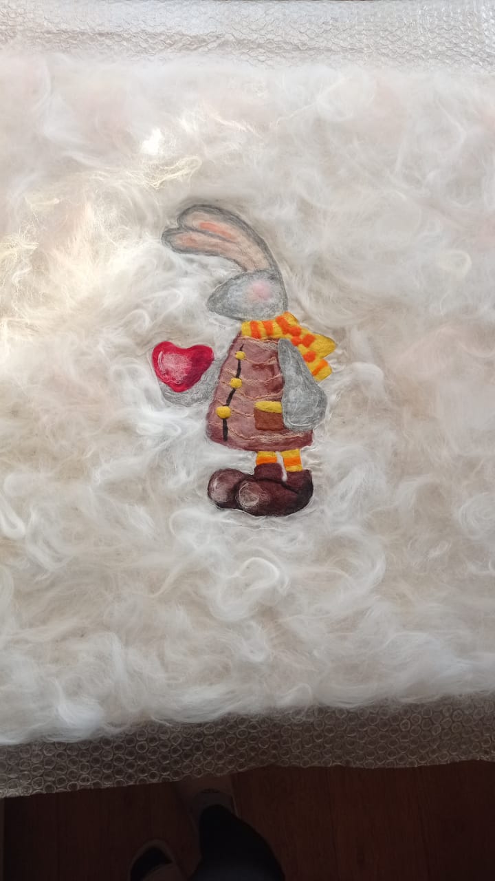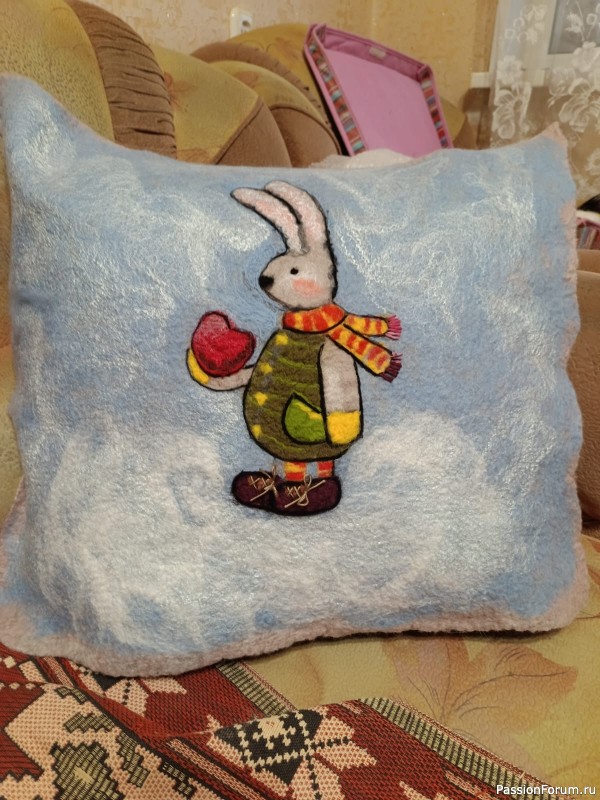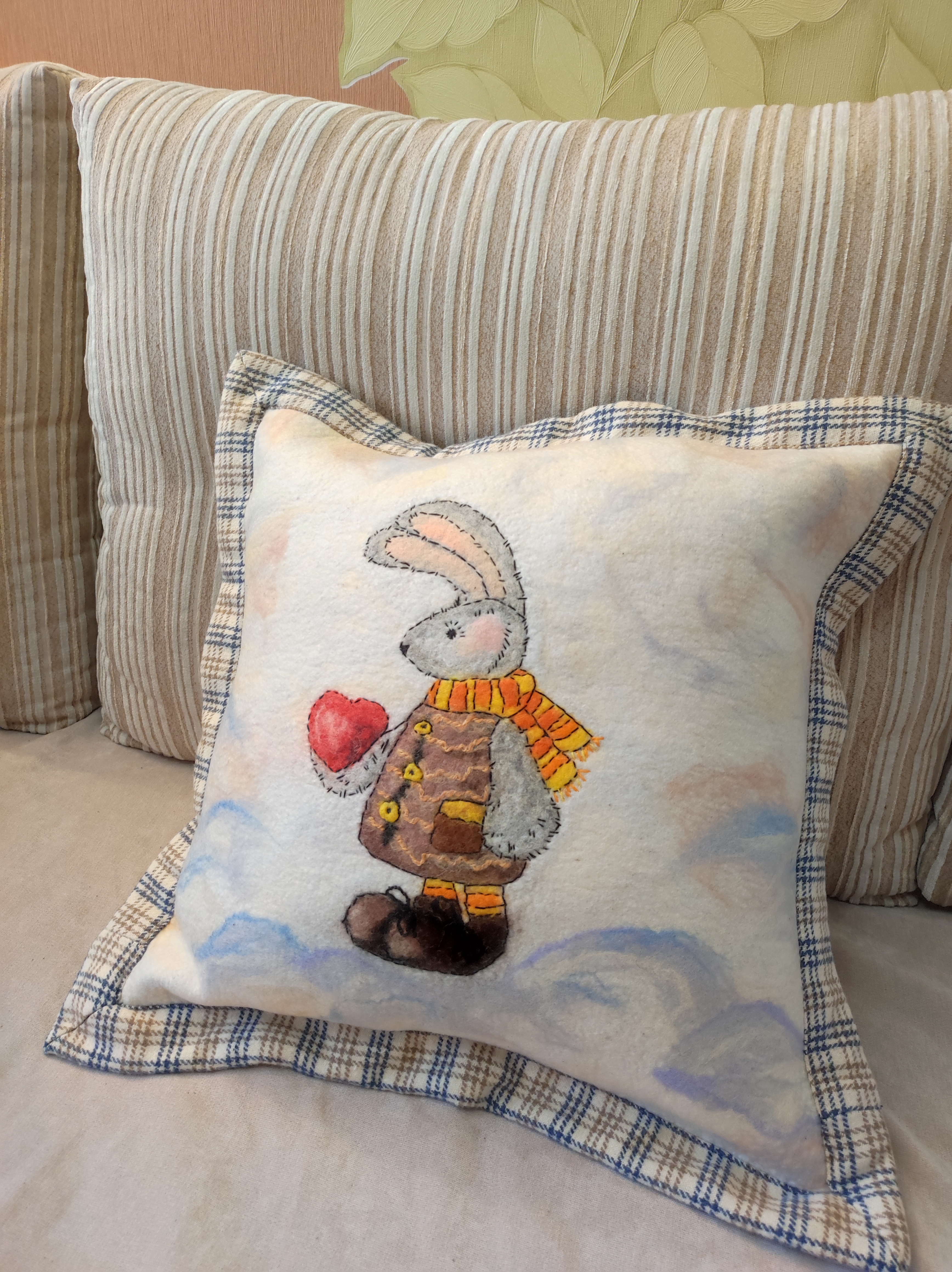 Добрый день, друзья! Долго думала можно ли в конкурсе представить эти чудесные работы. Ведь их делала не я ! А мои "ученицы". Дело в том, что я первый раз в жизни провела МК по валянию. Для меня это очень серьезный шаг и своего рода маленькая ступенька по творческой лестнице. Это девочки попросили провести МК по подушке и нанесению рисунка шерстью. Первого зайку, которого делала я, возможно, вы уже видели.