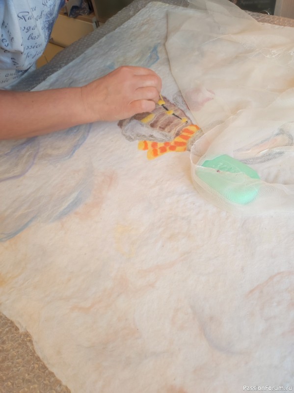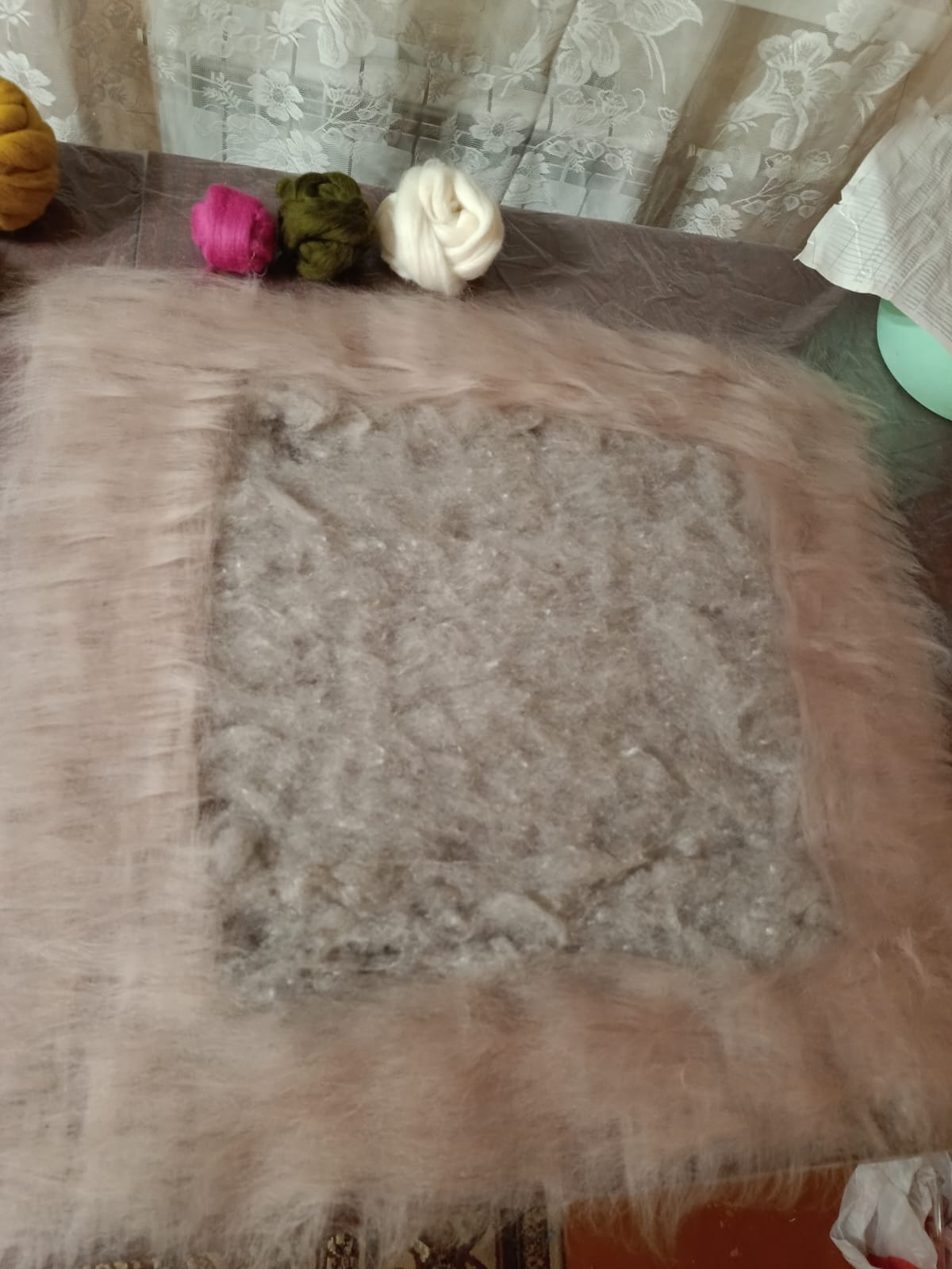 Для работы понадобилось 100 гр. шерсти на основу, остатки шерсти разных цветов и оттенков ( для рисунка), нитки мулине, ткань 60 см, молния потайная и все атрибуты для валяния (сетка, вода, мыло, перчатки, ВШМ, полотенце, пленка).