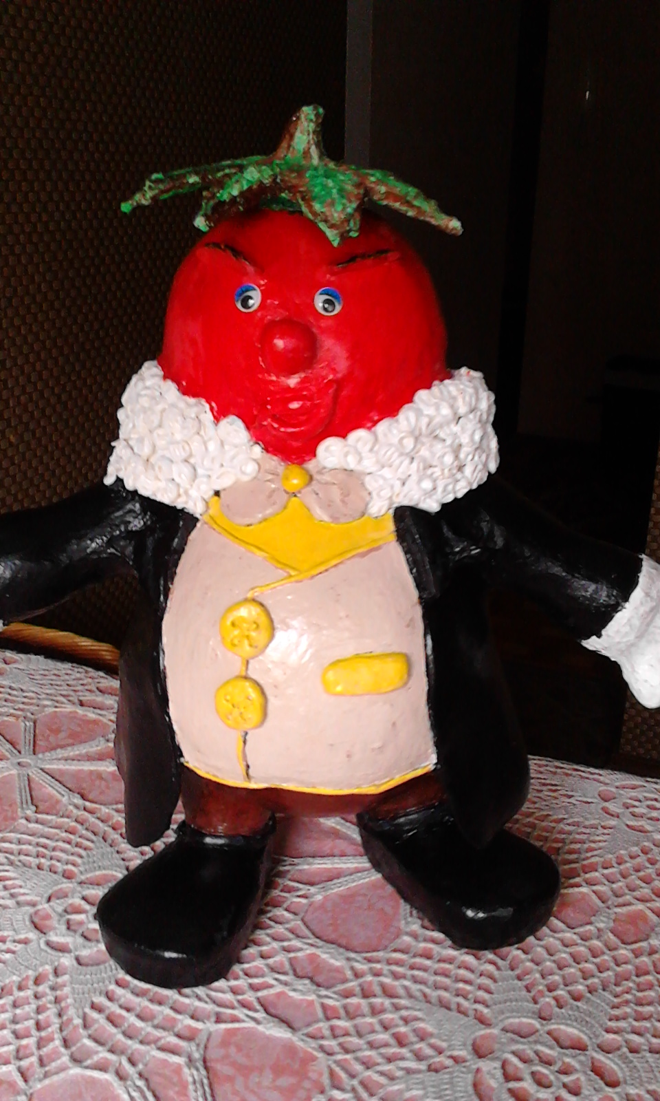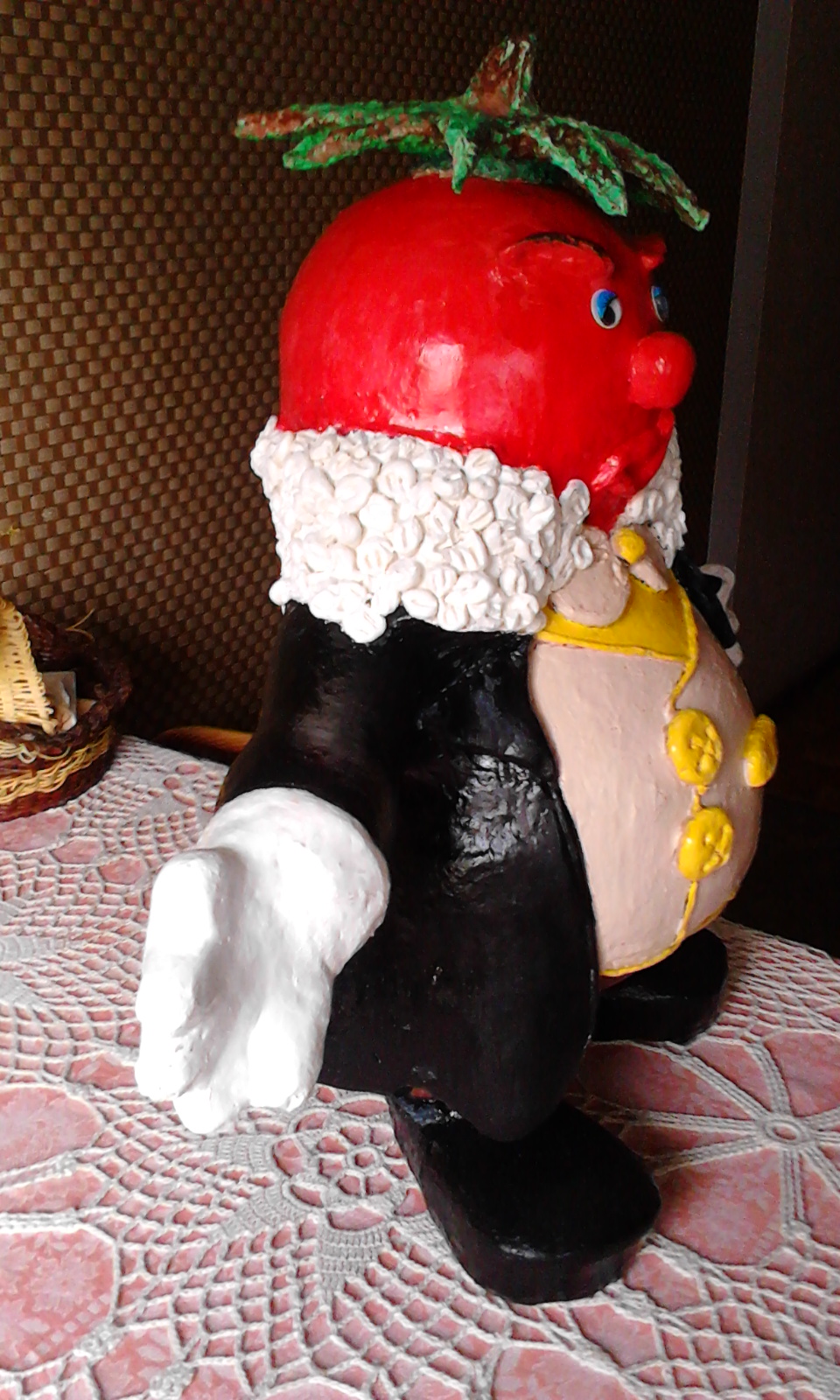 Важный какой! И руки-загребуки (как в рекламе). Снова прошу прощения, но… Вот подобные глазки, покупные, бегающие делают игрушку какой-то дешёвой. Представьте этого Сеньора с другими глазками (просто шарики со зрачком, например; из той же бумаги). Мне кажется, Сеньор Помидор стал бы интереснее, эмоциональнее. Ещё и веки синие ему совсем не идут.Зато наряжен преотлично!