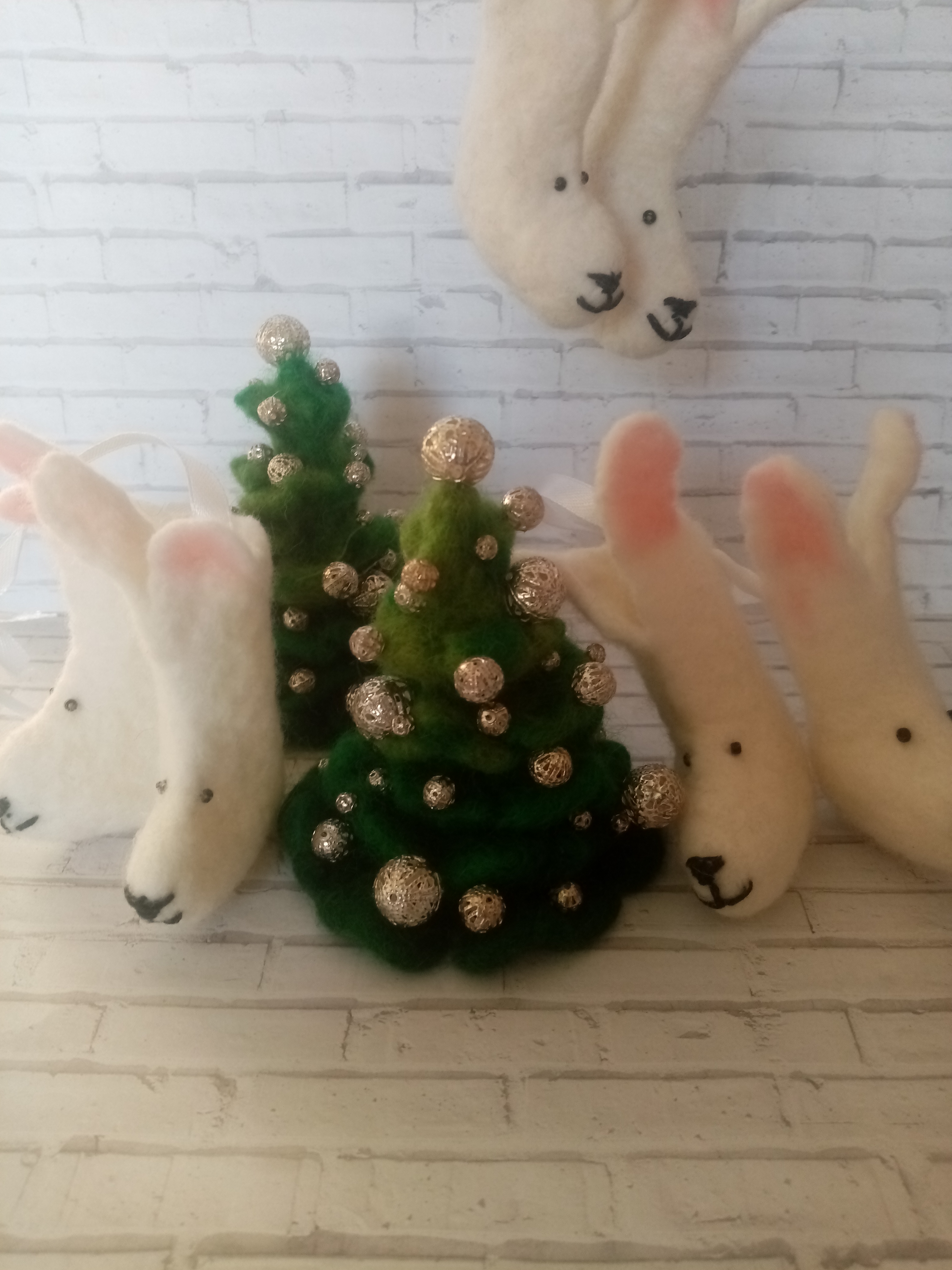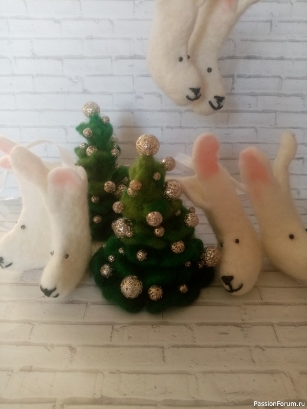 Мариночка! Спасибо за добрые слова! А елочки тоже валяю в подарок. Делаю на подложке в виде морковки(сантиметров 20 высотой), раскладываю шерсть елочкой, притираю и присбариваю ниткой несколько складочек по кругу(нитку потом убираю), Полученные складочки валяю, как уже чувствую, что достаточно- прорезаю «веточки»( надрезы 1-1,5 см, подваливаю открытые срезы.Елочка уменьшается в высоту раза в 2-2,5. Сохнет, украшаю на свой вкус. Все просто, удачи!