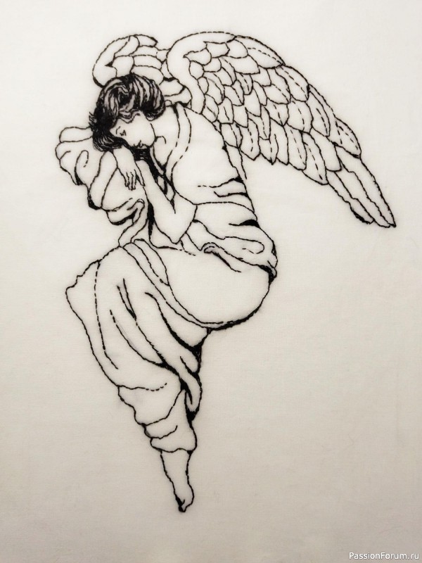 Вышивка-монохром; белая бязь, черные шелковые нитки для вышивания. Техника — швы " вперед иголку", «назад иголку», гладь