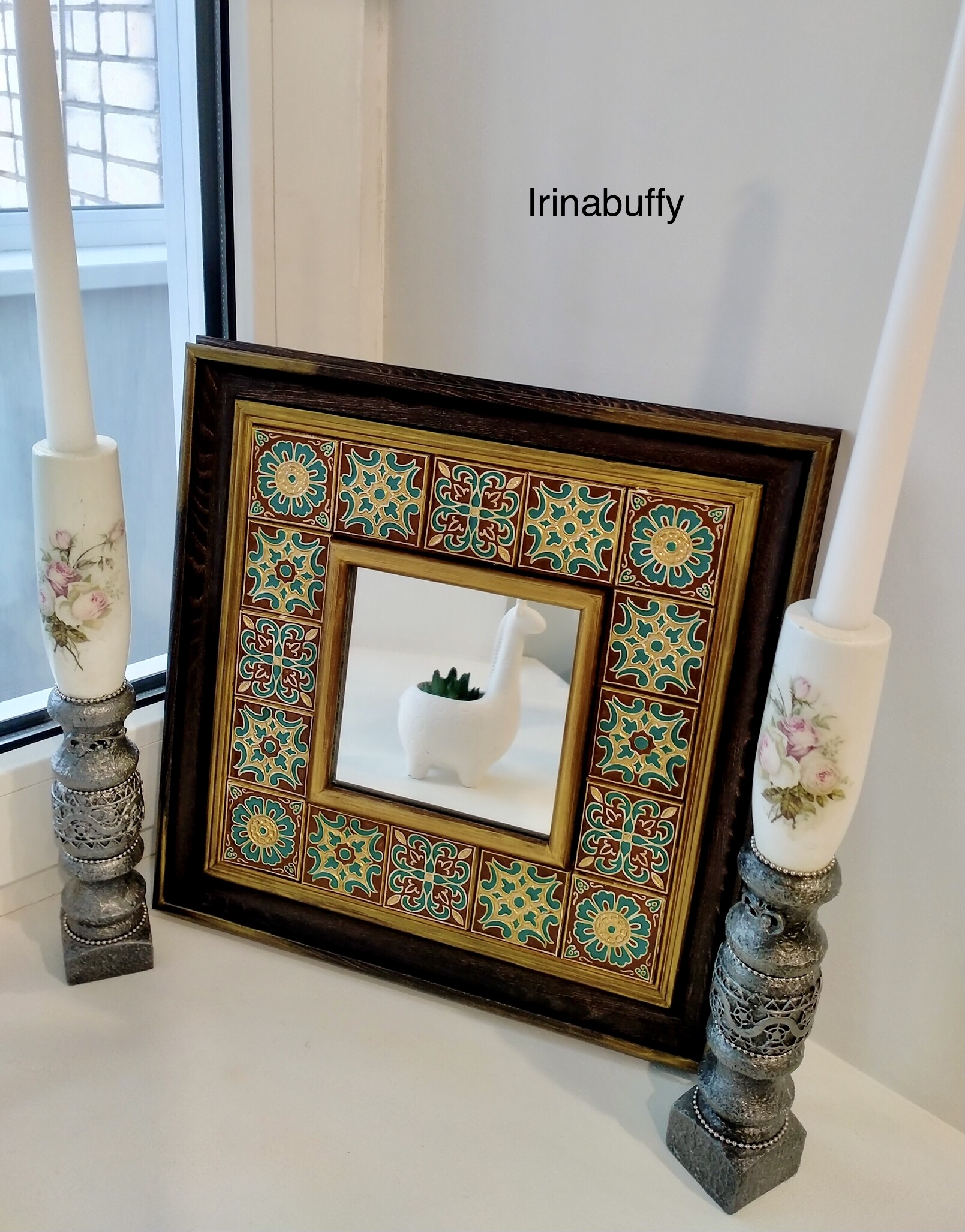 Потрясающе красивое зеркало- плиточки разрисованы с ювелирной кропотливостью- они безподобны! А в купе с подсвечниками смотрятся как интерьер королевского замка. Шикарно получилось, профессионализм на высшем уровне! Что ни работа, то восторженный шок для нас! Ирочка спасибо за красоту!