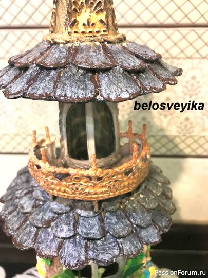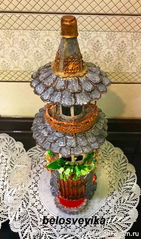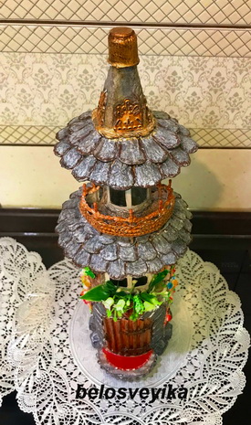 Благодарю.Мне эта идея сама в голову пришла.Надела первую крышу«юбочку» и подумала, что нужно на ней балкончик сделать. А если будет балкончик, то вторая крыша нужна, чтоб балкончик не заливало.А перед глазами лежит коробочка для яиц и такой остренький конус между рядами, отрезала этот конус, примерила, а он точно на горлышко садится.Ну к нему приклеила вторую крышу «юбочку» и получились две крыши.