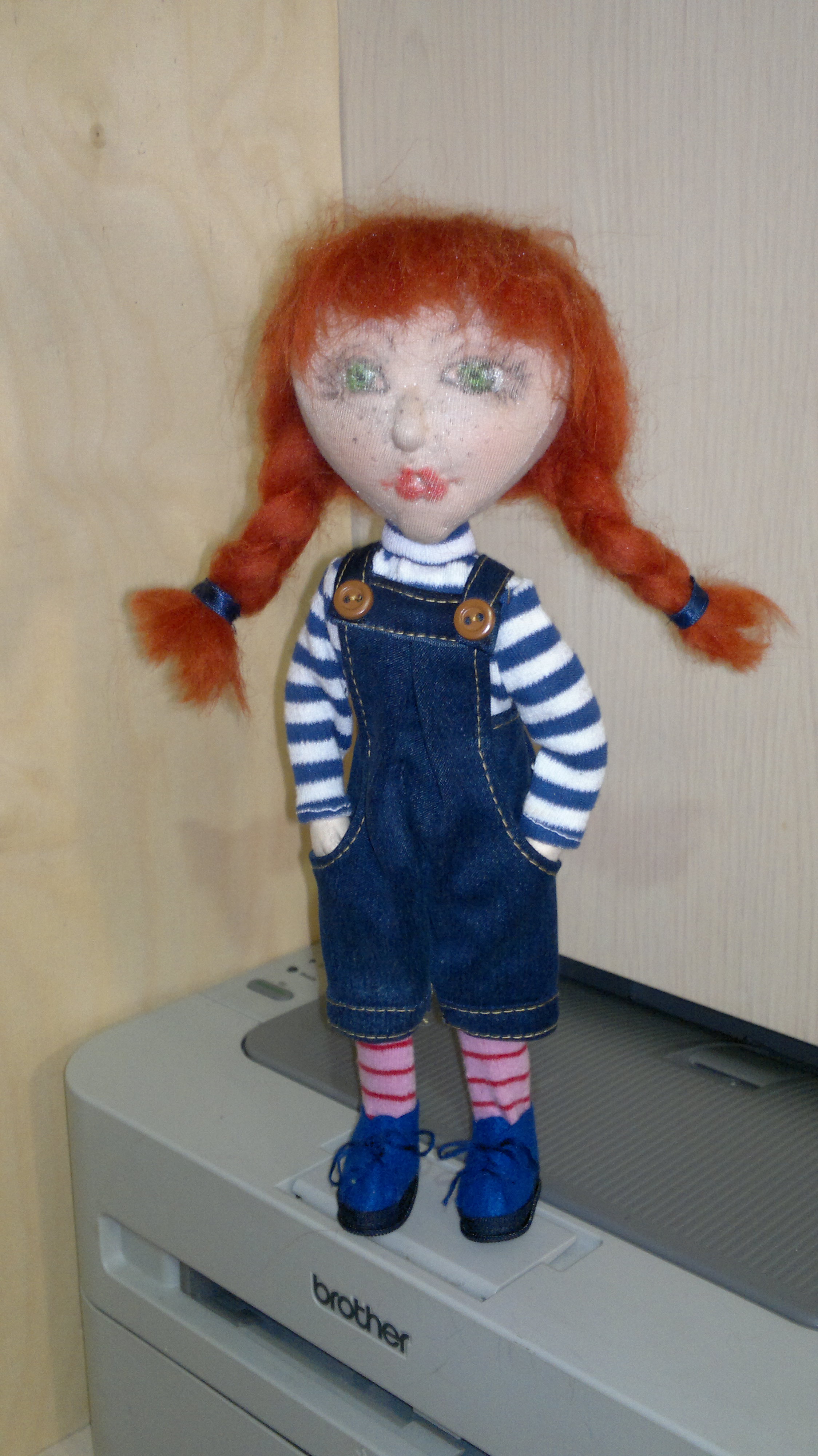 А еще я бы вставила прямо в косы проволочку медную( рыжый цвет) и загнула косы в разные сторны, как у Пеппи длиный чулок.