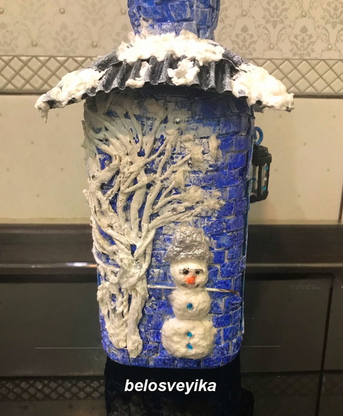 благодарю.Он всем нравится, а вся изюминка, это изначальная форма бутылки У нас редко где встретитшь квадратную бутылку, плоски и круглые есть, а это мне отдали от виски.Именно такая форма делает домик позожим на домик.Ну и окна попросились большие, а цвет окон потянул за собой стекла из синего файла.А делать ночник была задумка изначально Ну и милоту добавила вязаным ковриком и шарфиком у снеговика Да и зелень в горшках не хотела пластиковую.Решила тканевую сделать Мне, у моего другого домика, девчта писали, что пластиковые цветы все портят.