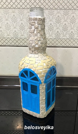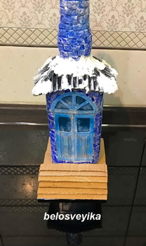 Бутылку окрасила белым акрилом.Все, кроме места под окна и дверь.Картонные окна и дверь окрасила голубым акрилом.