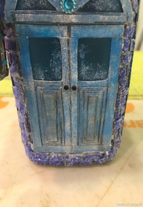 Изнутри окон и двери приклеила синий пластиковый прозрачный файл, имитация стёкол.