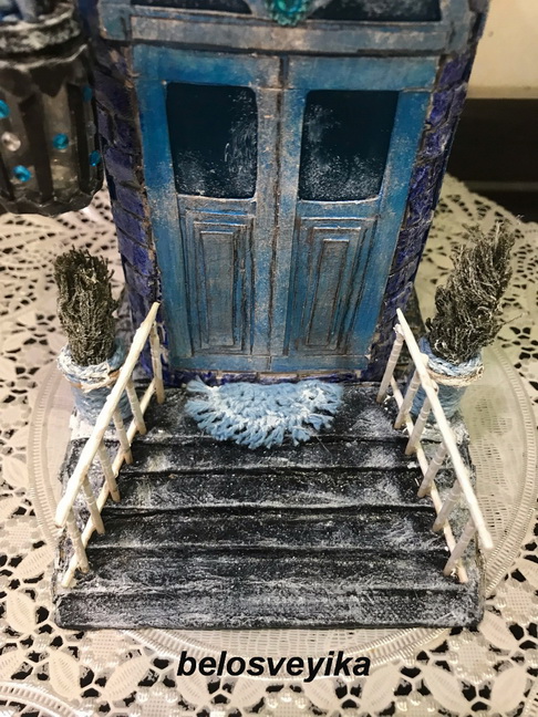 Снега показалось мало, решила добавить снега из папье маше(туалетная бумага замочена с кипятком, остужена, отжата, перемешана с клеем ПВА)Меленькие голубые украшения приклеила на круглые арки двери и окон.
