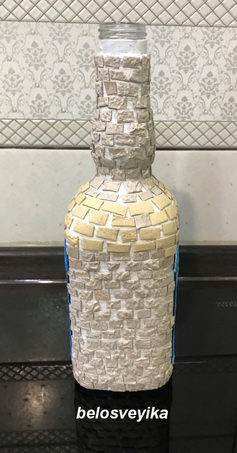 Бутылку оклеила салфетками, затем декорировала кирпичиками, которые вырезала из лотков от яиц.