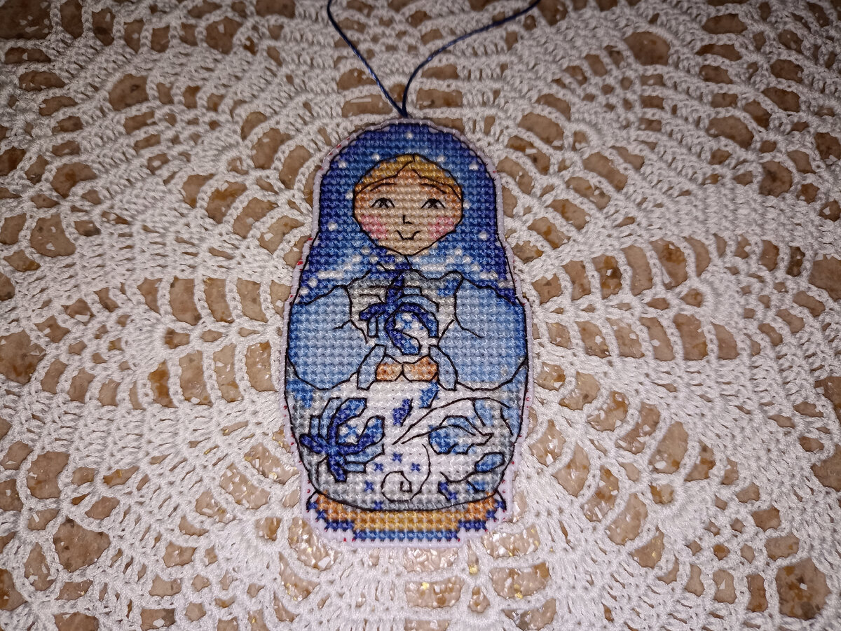 А также я закончила вышивать набор для вышивки нитками на пластиковой канве - набор от "Жар-птицы" (или от "М. П. Студии"). Вышиваются четыре матрёшки - магниты, но я девочек оформила в игрушки на ёлочку.