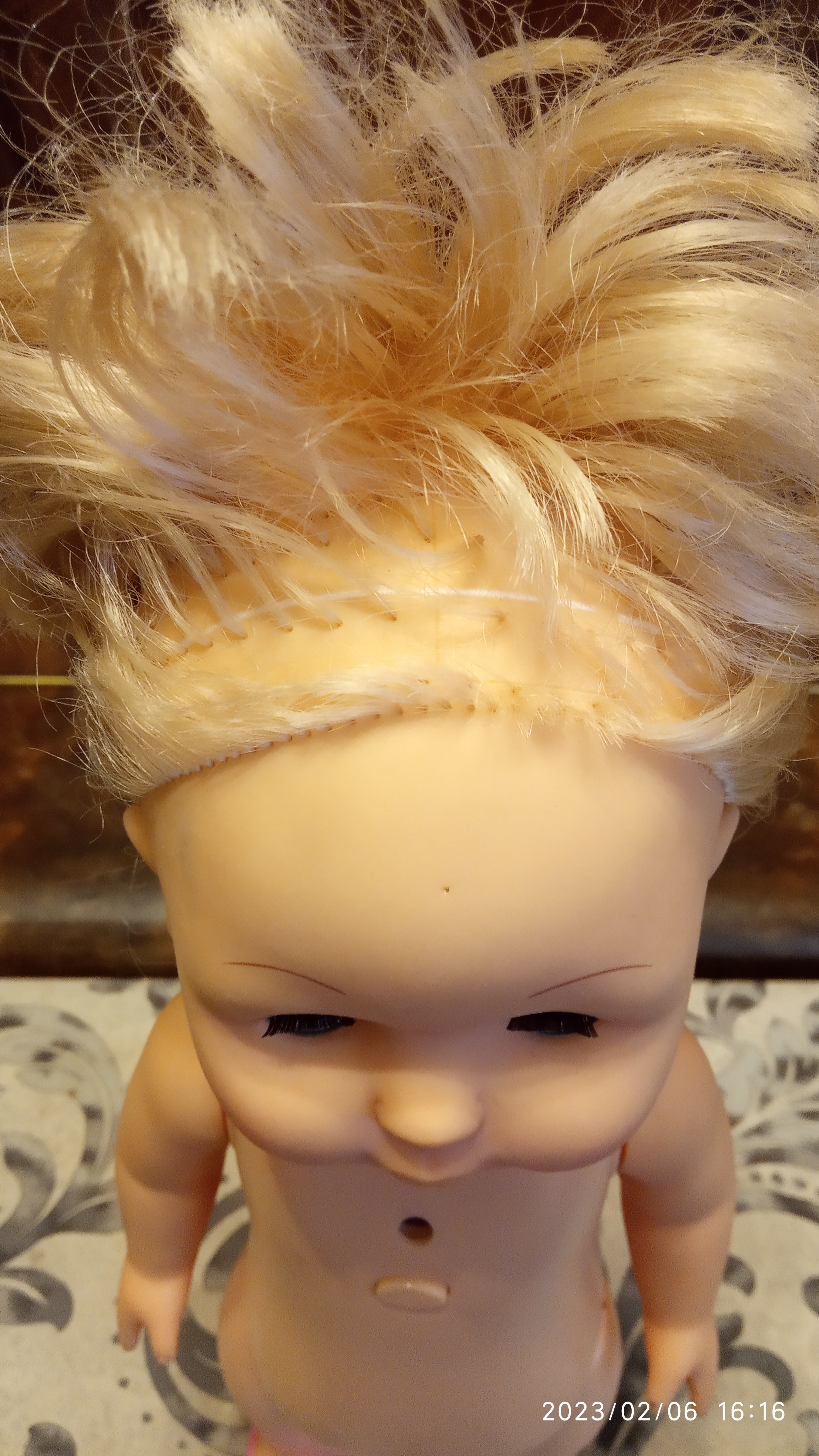 Перепрошивка совсем не сложное дело, я бы эту куколку допрошила ее же волосами, густота позволяет убрать несколько прядей длинных. Посередине узелок и в два прокола с лица на лицо прошивать. Узелок потянуть во внутрь. Держится крепко, никуда ничего не убегает и не развязывается.