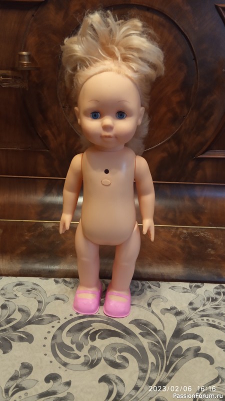 Первая была почти в идеальном состоянии. Одета в футболку и комбинезон (почти чистые). У нее были очень сильно спутаны волосы и жуткий маникюр на руках. Руки отчистили, вымыли, волосы вычесали. Одежду постирали. И выяснилось, что кукла говорит и зовут ее Маша. Внук не дал ее отнести в сад, сказал она ему самому нужна.