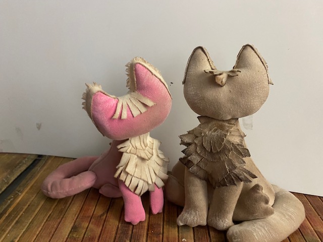 Для изготовления этих котиков я использовала: бумагу и карандаш для выкройки, кулирную гладь, нитки, иголку, ножницы, кофе, акриловые краски. немножечко запекаемой пластики(для носиков и брошки), атласную ленточку для бантика. цветок, вроде всё.