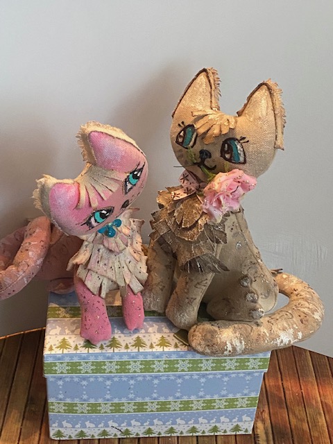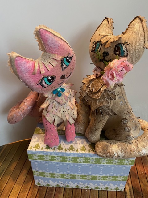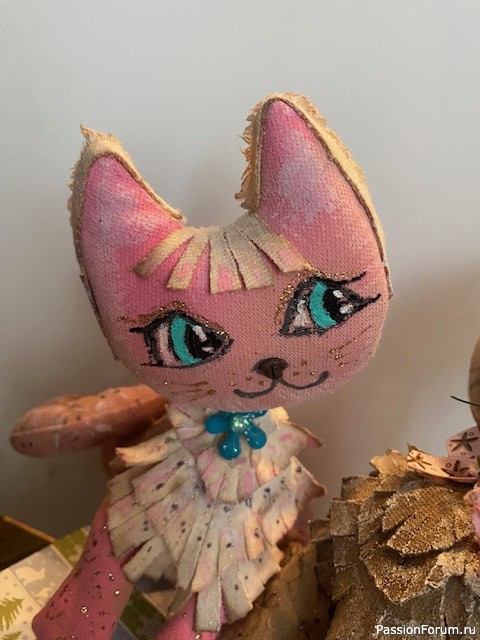 Котику рисую немного другие глазки, наклеиваю носик из пластики и золотой интерферирующей краской подкрашиваю тоже для эффекта. Серебряным акриловым контуром рисую тоже абстрактные закорючки.А в рот закрепляю цветок. Цветок взяла готовый, но затонировала его в розовый цвет и немного "позолотила" краешки. Да, и атласный бантик в тон - на шею.