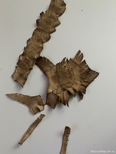 Из обрезков кулирки составляю вот такие имитации шёрстки для чёлки, груди, ушек и хребта кошек. Так смотрится объёмнее и красивее. Просто выбираю подходящие кусочки, разрезаю их по краям, накладываю с нахлёстом друг на друга и склеиваю "Кристаллом". Затем тоже тонирую раствором кофе. Для кошечки - один раз, потому что хотела очень светлый тон. Для кота тонировала три раза, чтобы было потемнее.