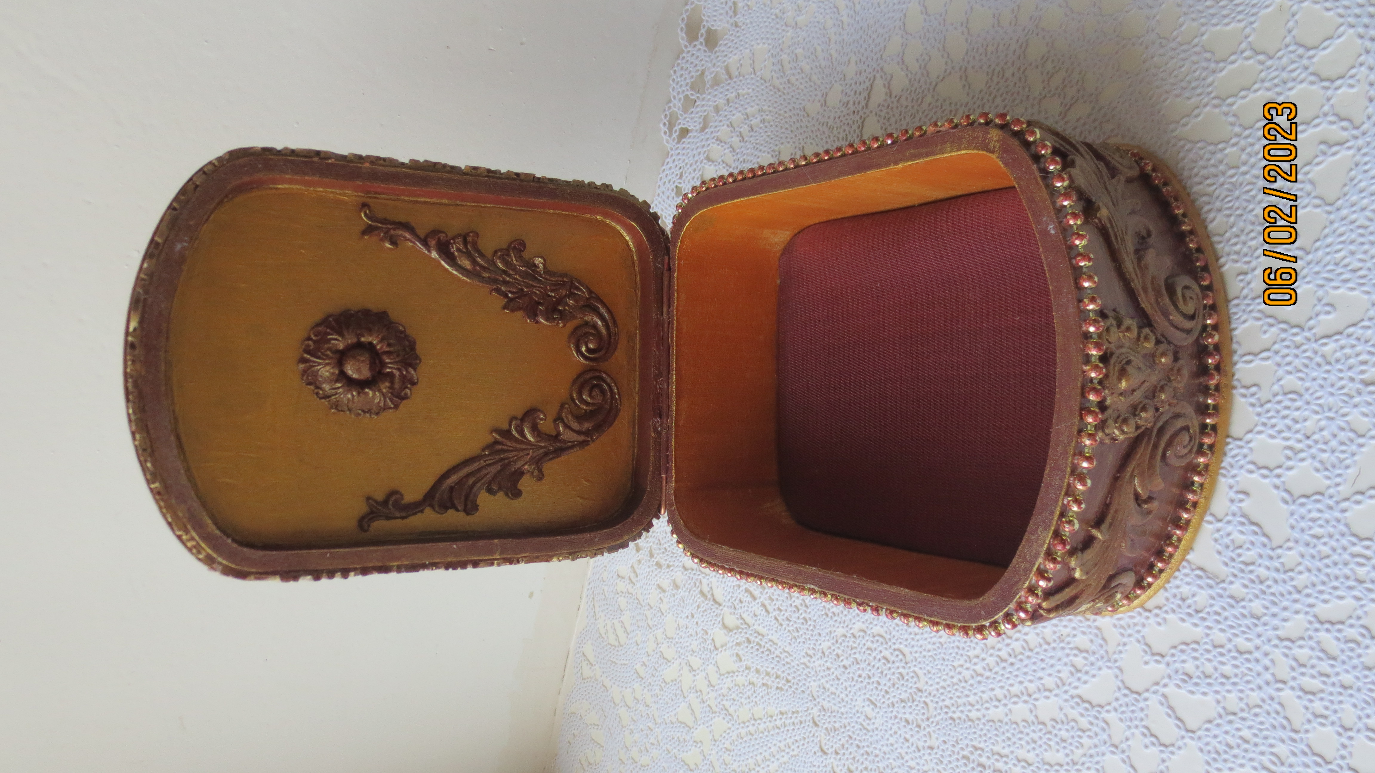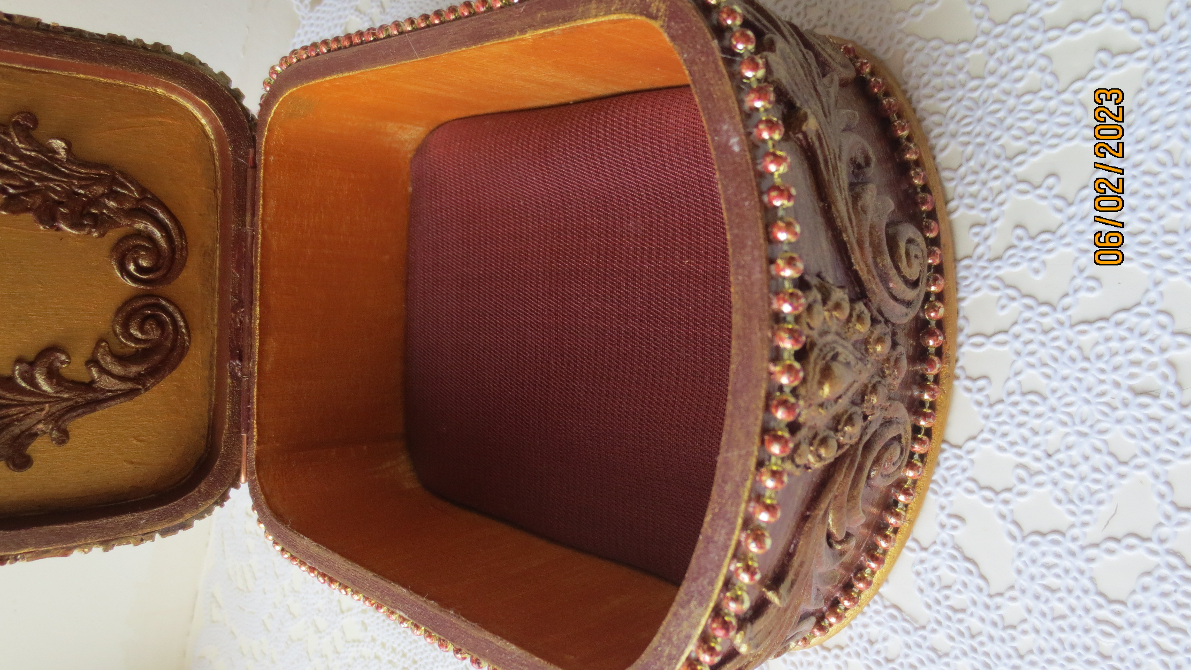 Получилась шкатулка с историей! Надюшь, а ты не рассматривала другой вариант внутренней части шкатулки? Имею в виду, вместо тяжеловатого картона, обтянутого тканью — использовать флок или просто покрасить.