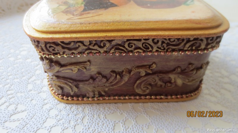 Эта шкатулка из МДФ.Картинка напечатана на бумаге на струйном принтере.Но я её вживила (предварительно пролакировала по лицевой стороне картинки несколько раз).Когда очистила картинку от бумаги,один раз покрыла лаком,ошкурила по контуру.Потом снова лакировала,делала просушку.Шкурила.И так много раз.Лаком покрывала разным (то декупажным глянцевым,то лаком для волос.)Вот так у меня получились такие трещины(трещинки). ПО бокам шкатулки и внутри на крышке наклеила отливки из молдов,цепочку по контуру.