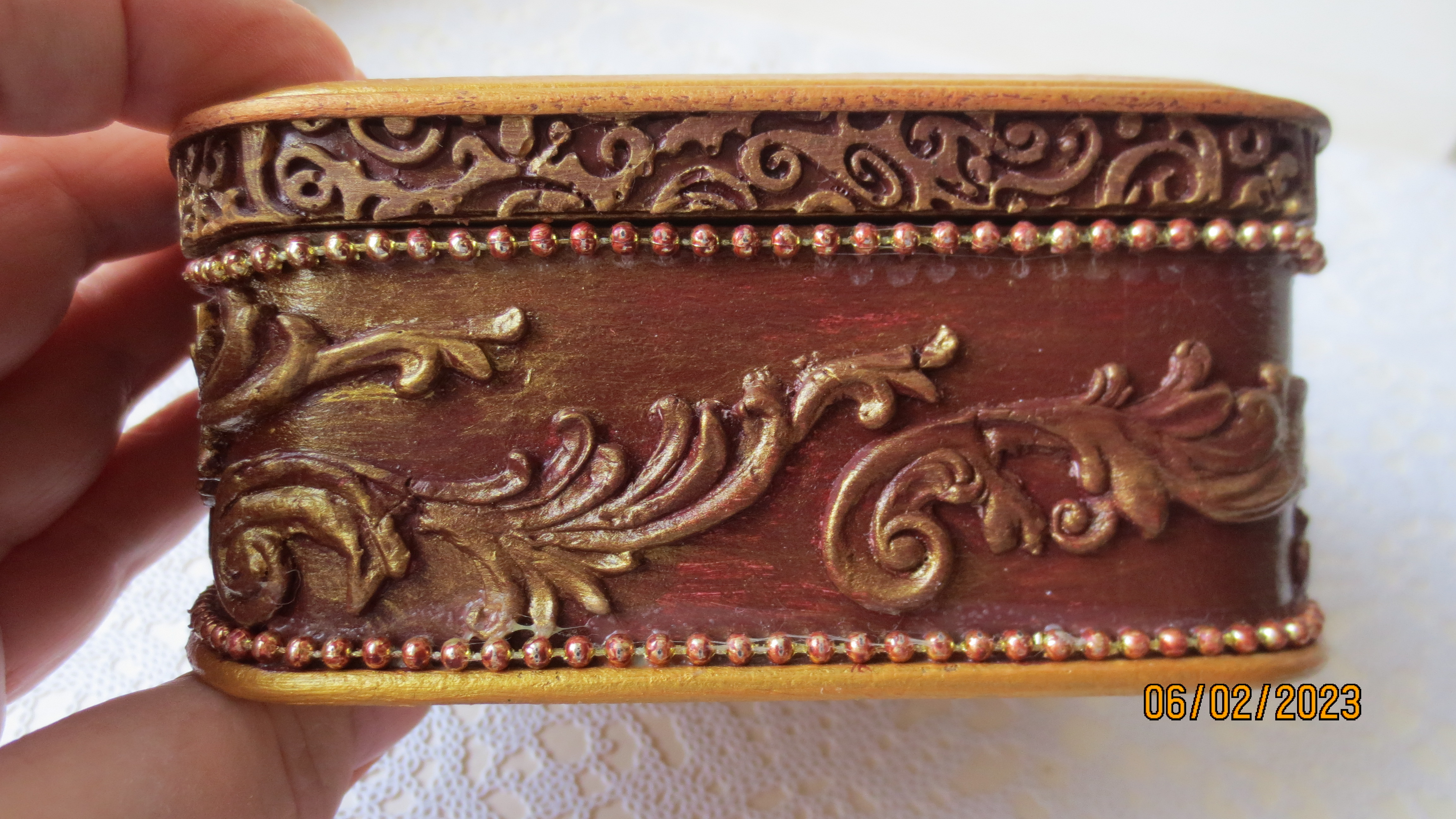 Очень хорошее состаривание мотива получилось. Единственное, что меня смущает это её глянцевая поверхность и чистое золото. Мне кажется немного не стыкуется старая шкатулка и блеск. Но может вживую это смотрится нормально. Трудно абсолютно судить по фотографии. А вообще шкатулочка очень милая.