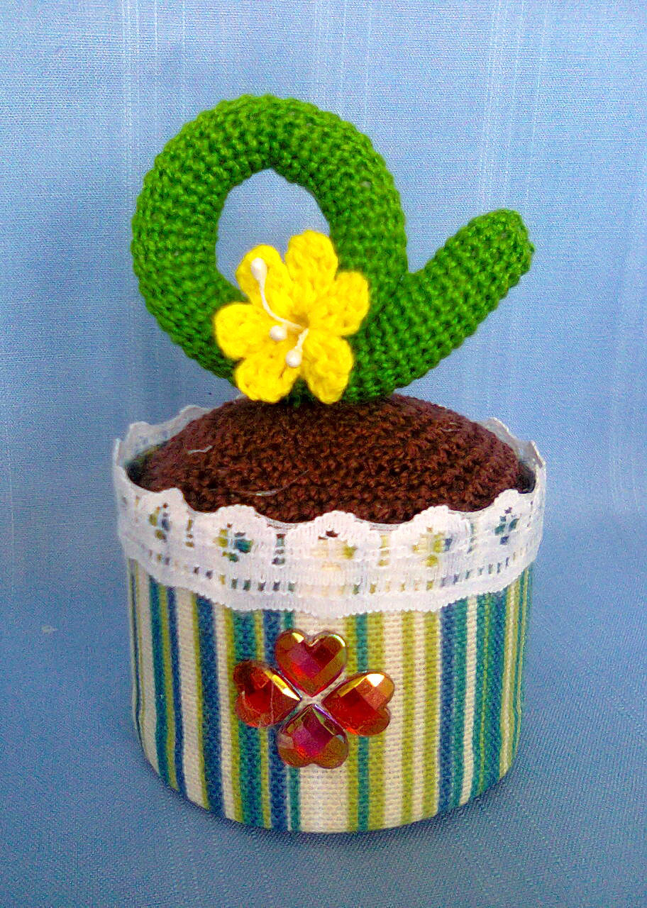 на приклеивание по краю горшка. В моем случае - 13 рядов. Можно так же связать грунт на всю глубину горшка и закрыть в обычном для закрывания круглой детали ритме. Не забывайте о набивке.
