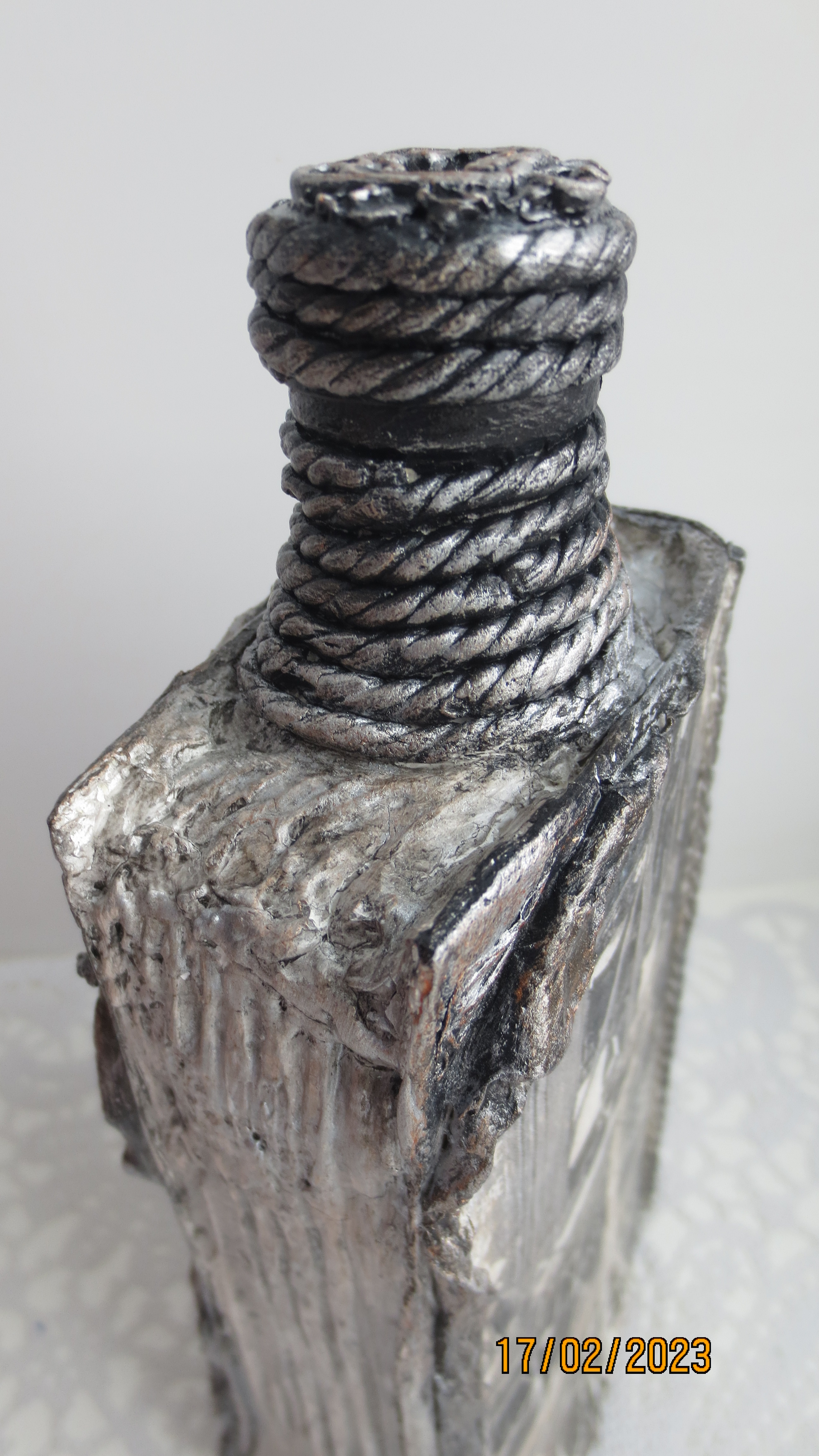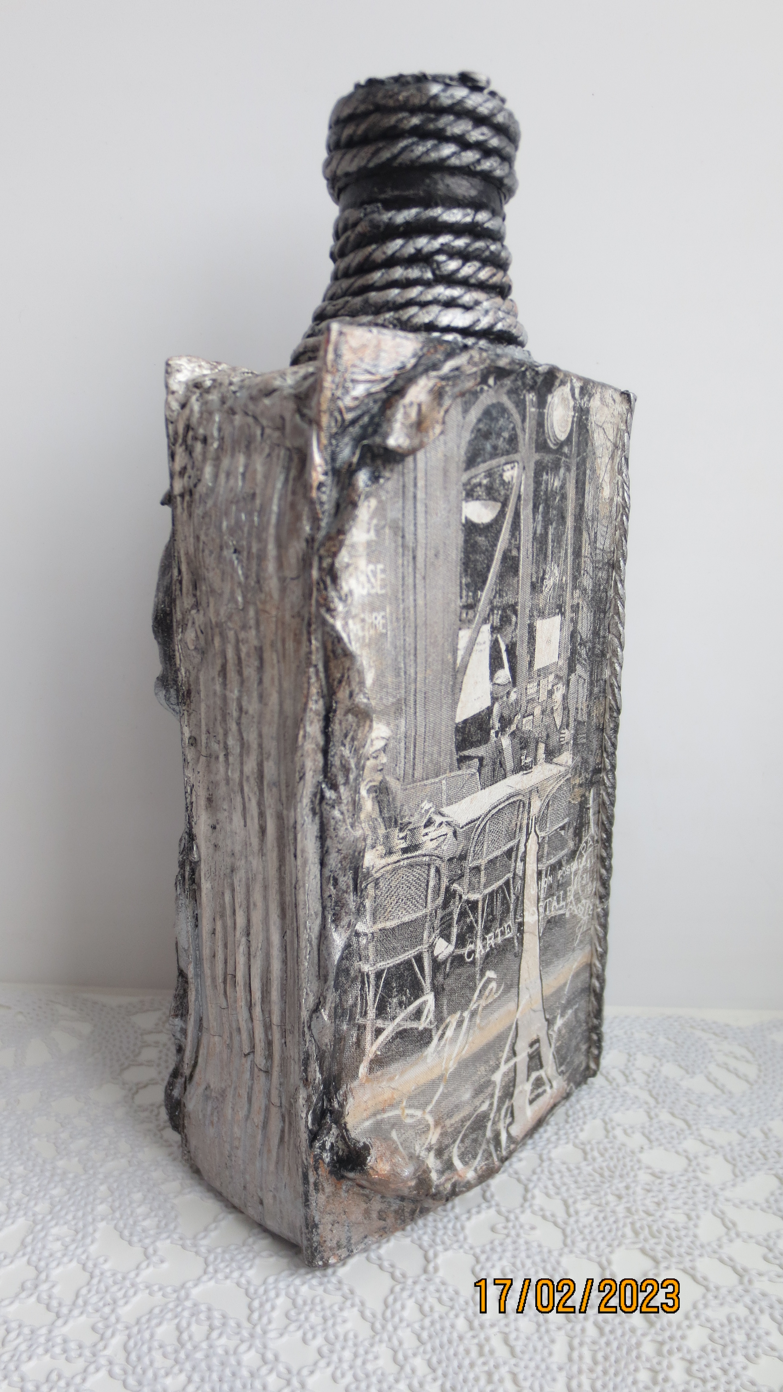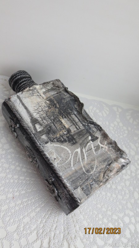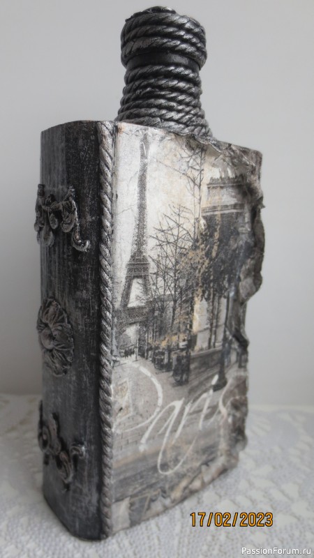 Вот изготовила ещё одну бутылочку,бутылочку-книжку.В закромах нашлась часть салфетки с изображением Парижских улиц.Решила её использовать.Правда картинка серая,но так ещё лучше.Раньше я делала обложки и корешок книжки отдельно,а в этот раз я взяла гофрокартон и обернула всю бутылку. Обложки полимерной глиной я сделала оборванные,потом наклеила салфетку.Из рельефной пасты сделала странички. На корешке узоры из отливок из полимерной глины.Корешок обрамила тоже отливками под верёвочку,горлышко бутылочки и пробку-тоже.Поскольку картинка чёрно-белая,я постаралась в таких тонах сделать всю книжку:потом оттенила серебром.