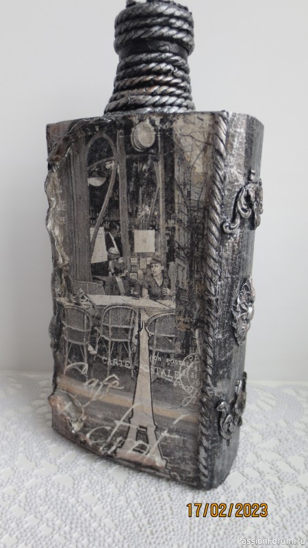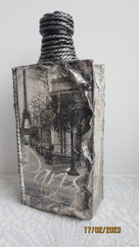 Надин!!! Прочитала все комменты.Каждый прав по своему.Один видит.просто Париж.как все города .другой.воспринимает его по своему-Сколько людей.столько и суждений.Я была в Париже и он меня разочаровал.Все мои радужные представления о нем рухнули.Когда мы читаем «Елисейские поля» то представляем красоту… А я увидела запущенный участок с чахлыми кустами роз и… У нас луга красивее и интереснее.Город практически без цветов.Рядом идут нищета и красота.Версаль и прочие достопримечательности супер красивые.Интересные.У меня не получилось полюбить Париж.А моя подруга чуть ли не каждый год едет в Париж.Вот такие мы разные.Мне бутылка очень понравилась.Да.немного тяжеловато смотрится.но времена ее так изменили.А сама работа очень понравилась.А если бы не было «веревочек» она бы смотрелась более изящной.Но мы же творим как МЫ видим.А я вспомнила поездку в Париж!!! Спасибо!!! И Ваш Париж зацепил многих.Вспомнили историю.Это же классно.А вы творите.Все чудесно!!!