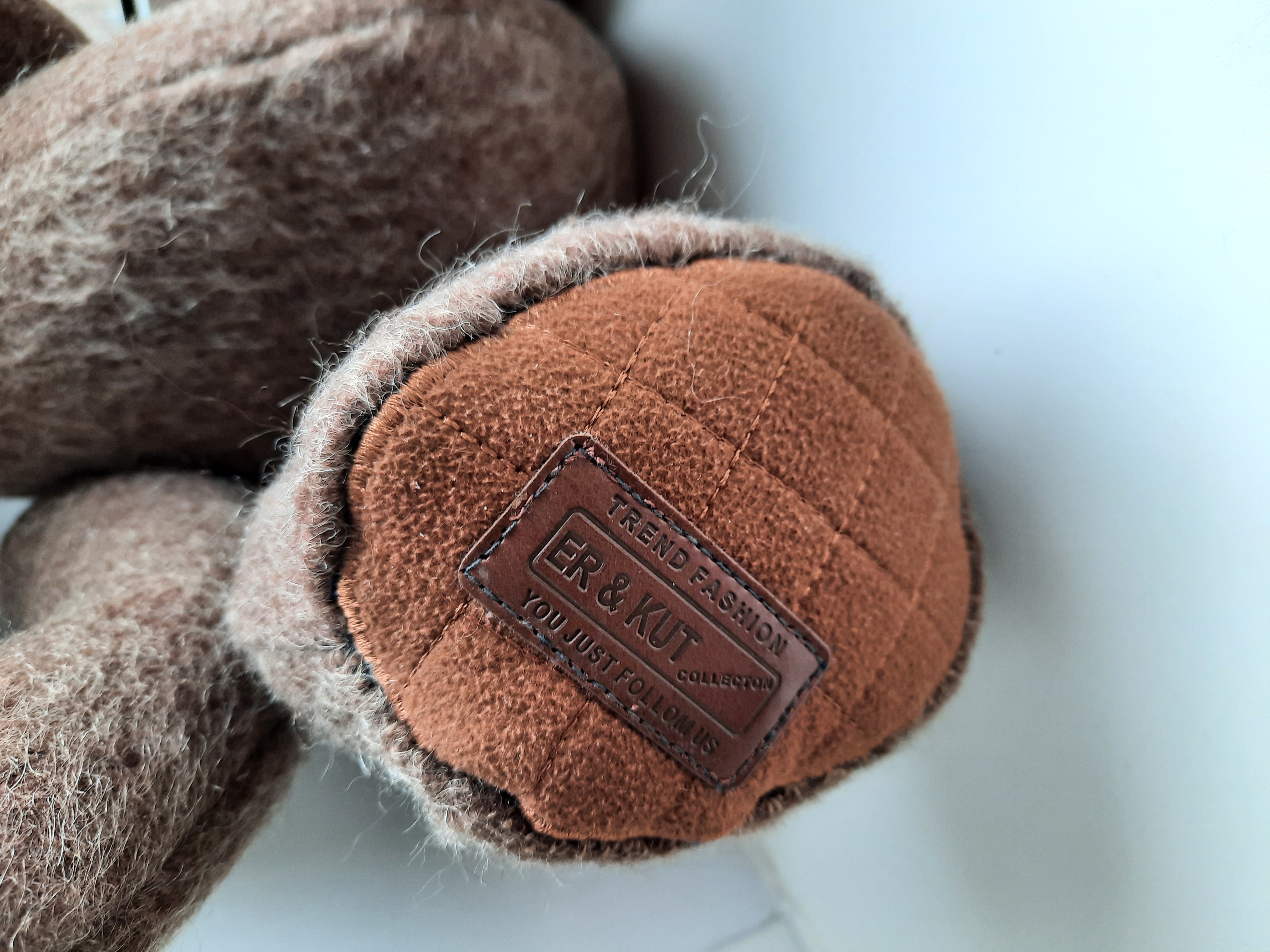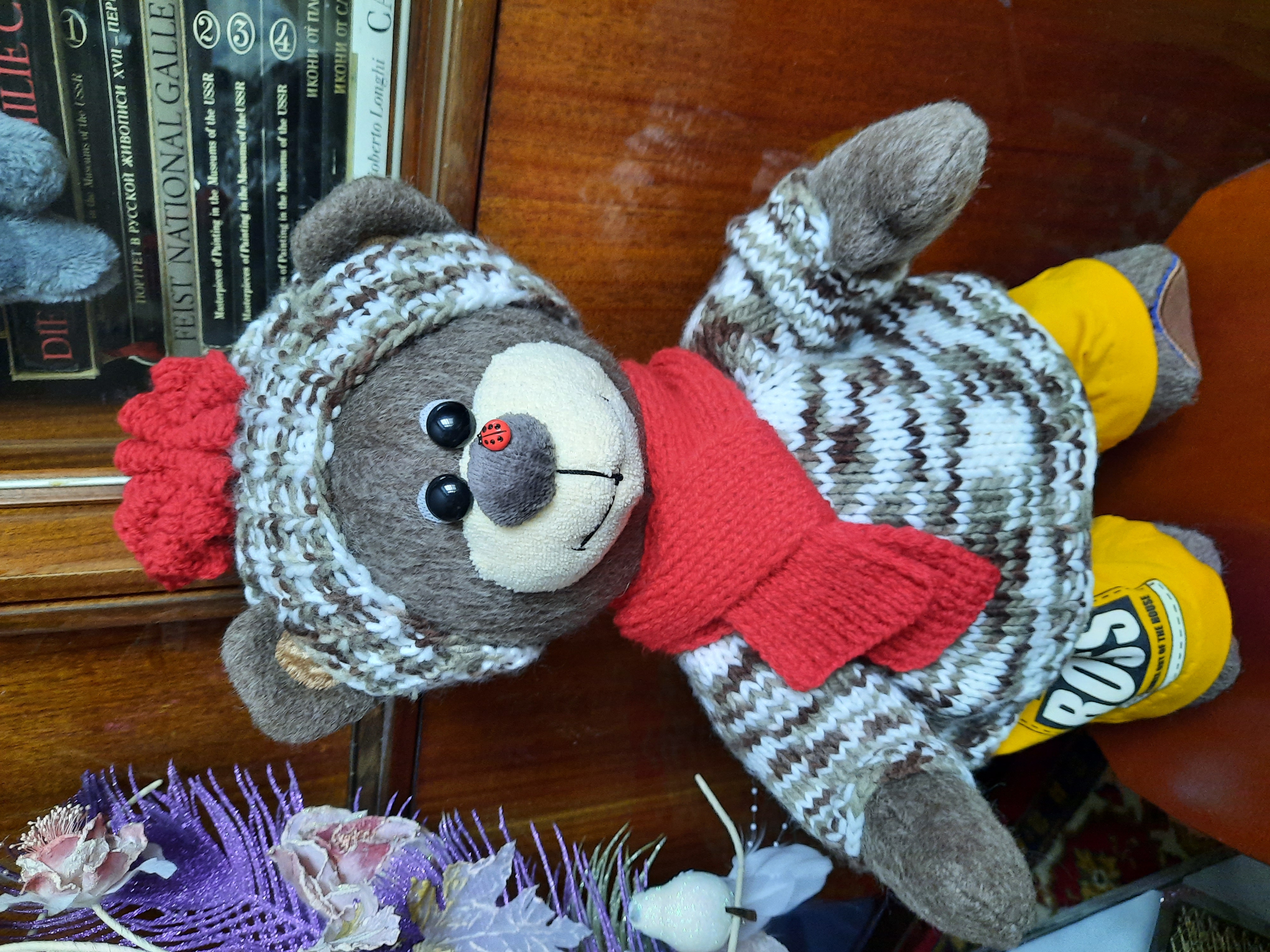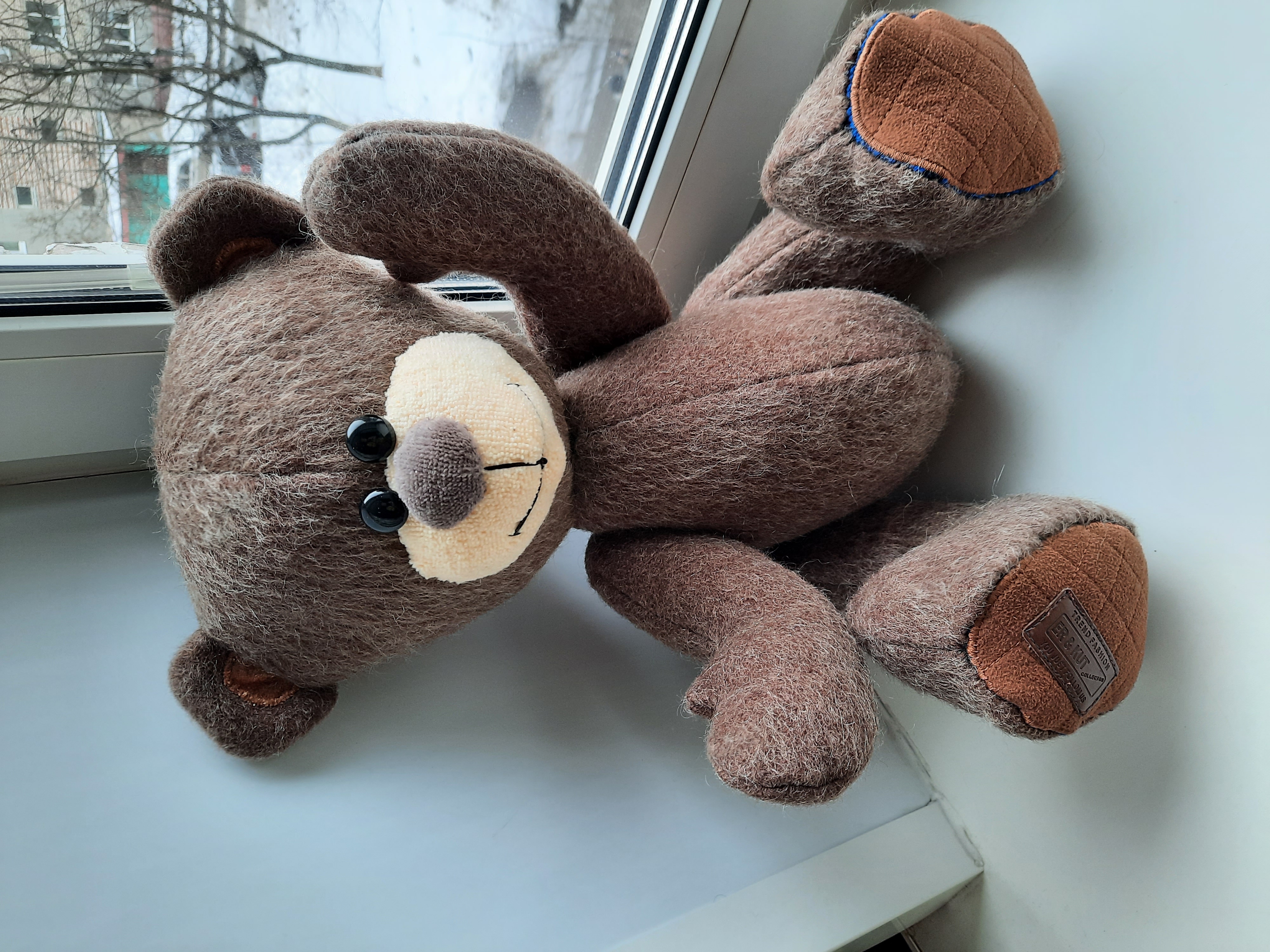 В память о друге сшила Мишутку.Сшит он из пальто,ткань из ламы,поэтому он в меру лохматый и по цвету бурый.А имя ему от надписи на штанишках-увидела их в магазине и сразу решила-для медведя!