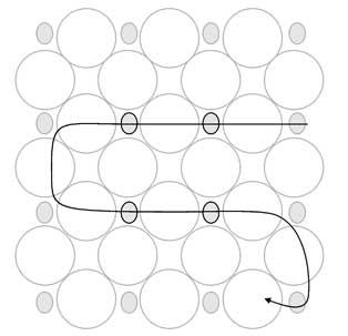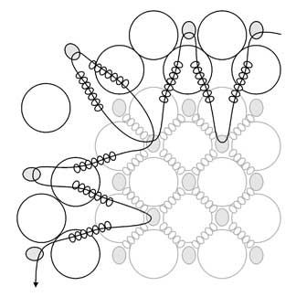 Оплетение внутренней части шкатулки начните с нижнего ряда. Второй можно пока отогнуть наружу, чтобы облегчить доступ к первому ряду. Пройдите по кругу, подшив между верхними бусинами первого ряда по одной бисерине 5/0. Замкнув круг, выведите иглу в первую из набранных бисерин. Низками из семи бисерин 11/0 соедините набранные бисерины с бисеринами донышка (рис. 6). На схеме показан фрагмент шкатулки. Обратите внимание, что низки крепятся не к крайним бисеринам 5/0 донышка, а к тем, которые находятся в середине «крестиков».