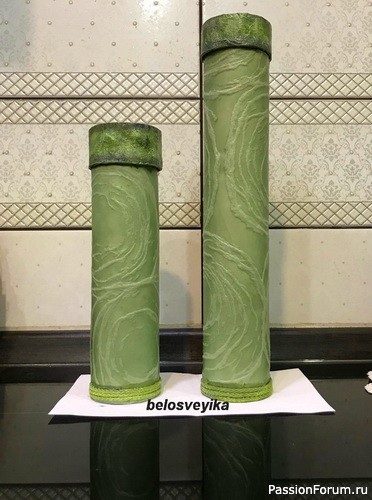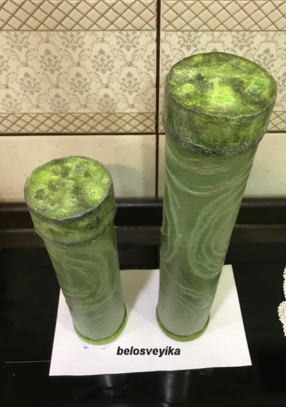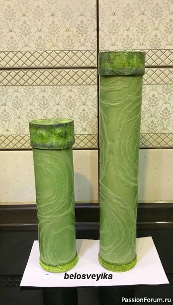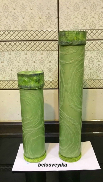 Решила я сделать систему хранения всяких рукодельных запасов.У меня много палочек для суши и много синельной проволоки.Лежит это богатство в пакетах.А длина у синельной проволоки такая , что не помещается в обычную втулку из под бумажного полотенца.А на днях мне принесли большую тубу.Я приложила рядом синельную проволоку и палочку для суши и, о счастье, они как раз поместятся, если разрезать по их размерам.Разрезала втулку ножовкой.Приклеила дно, оклеила дно салфеткой, покрасила белой краской.Сделала крышки из гофро картона.Крышки оклеила, окарсила белым, затем зеленым, затем решила изобразить малахит, попробовать так сказать.Сами тубы я оклеила бамагой белой от принтера. После вы1сыхания оклеила бумагой от букета..По низу накрутила три витка крученой веревки, но зеленый цвет был слишком яркий, я её покрасила.Вставила в длинную тубу запас синельной проволоки,, поместилась вся.А вот палочек оказалось так много, что надо еще делать тубу.И оказалось, что они все разной длины.Надо делать еще одну, высотой по самую длинную палочку..Если честно, я не знаю как долго будет держаться мой декор.Хотела ещё обмотать тубы серебрыной нитью, Но рисунок бумаги круги, переплетать их будет не красиво.Но если начнёт отклеиваться, сделаю что нибудь.Благодарю всех, кто зашел.Всем мира и добра.!