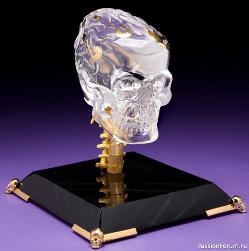 «Пылающий череп» из горного хрусталя на подставке из обсидиана, с отделкой из позолоченного серебра, Луис Альберто Киспе Апарисио, высота 25 см.