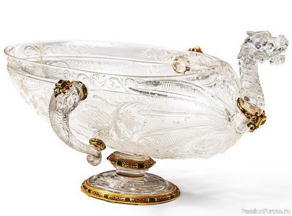 Чаша XVI века из горного хрусталя в форме дракона, возможно, работа мастерской Сарачи, в более поздней оправе из золота с эмалью и рубинами, длина 30 см.