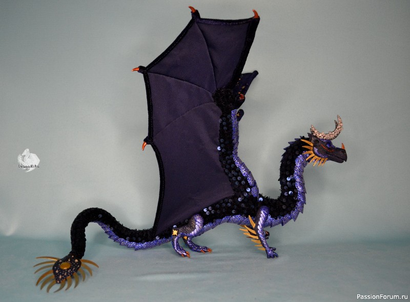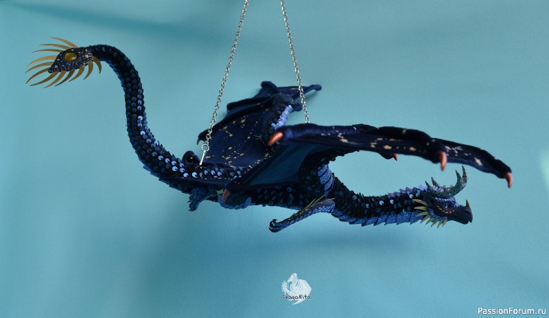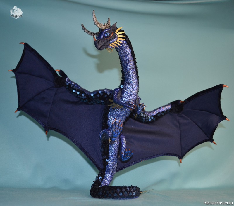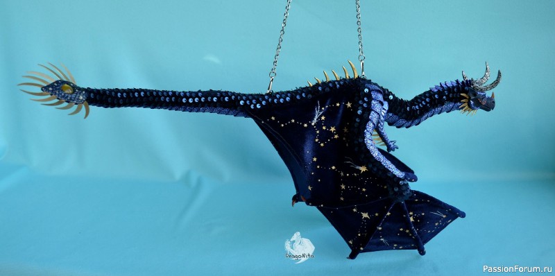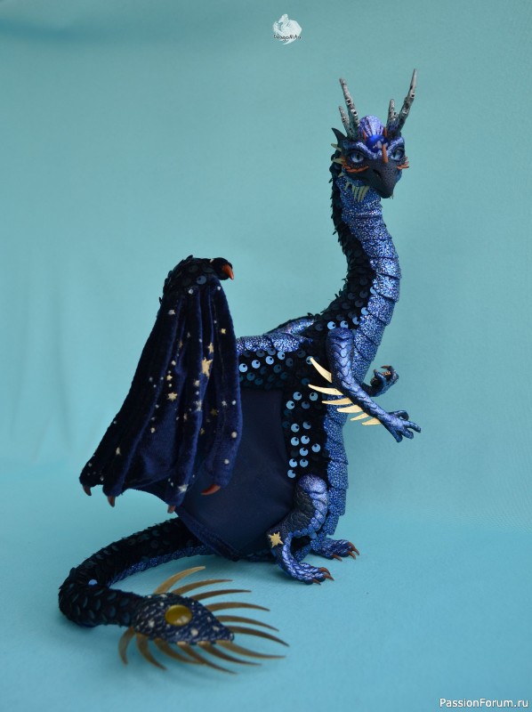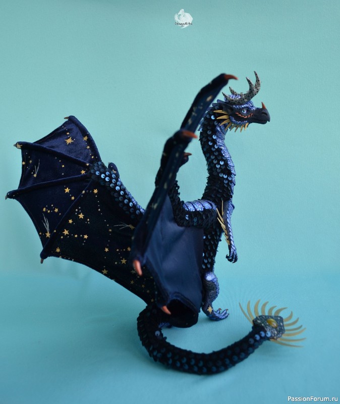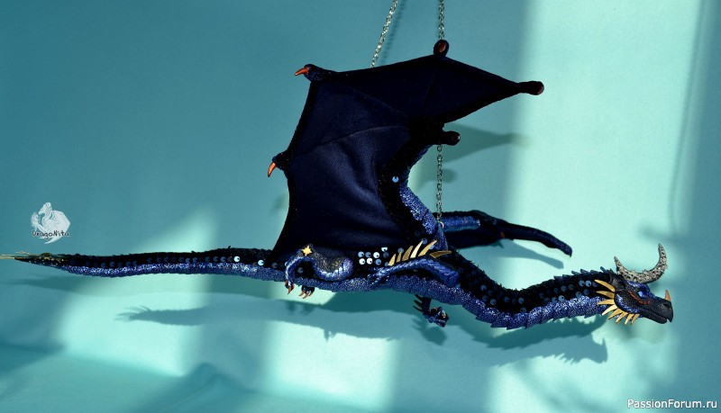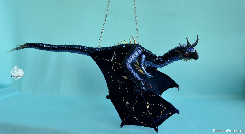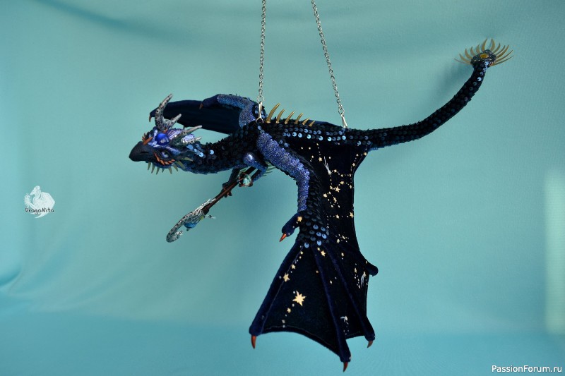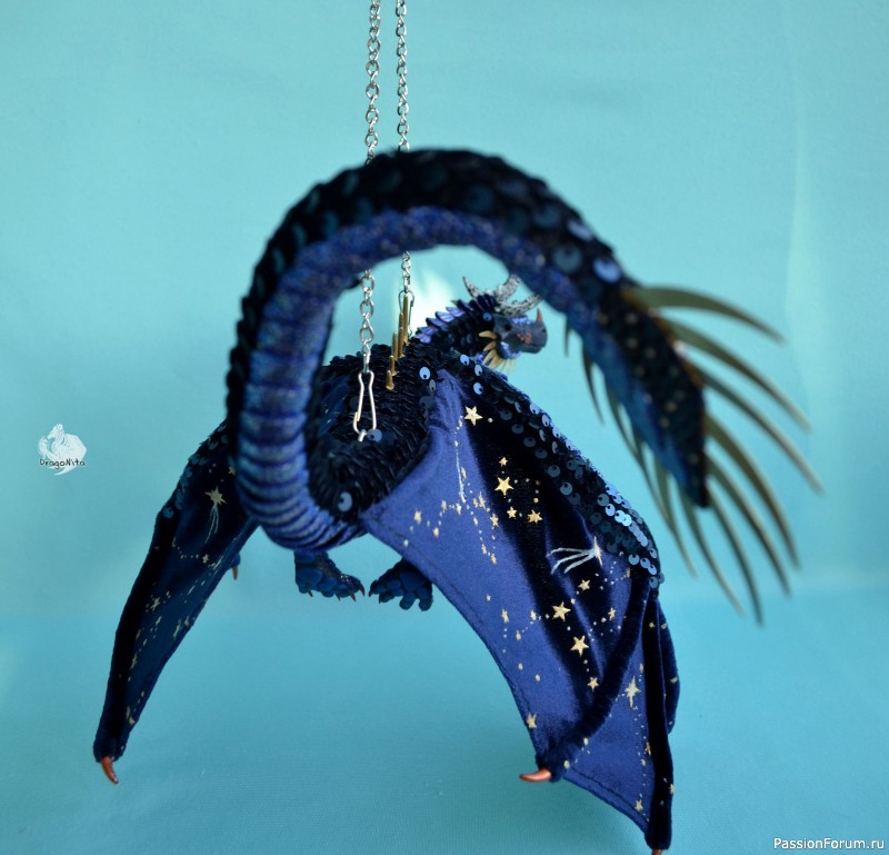 Лапы на нитяном креплении (шёлковые очень прочные нитки). Звёзды на рогах и крыльях ярко светятся в темноте голубым, если подержать дракона под ярким источником света. Крылья складываются и расправляются.