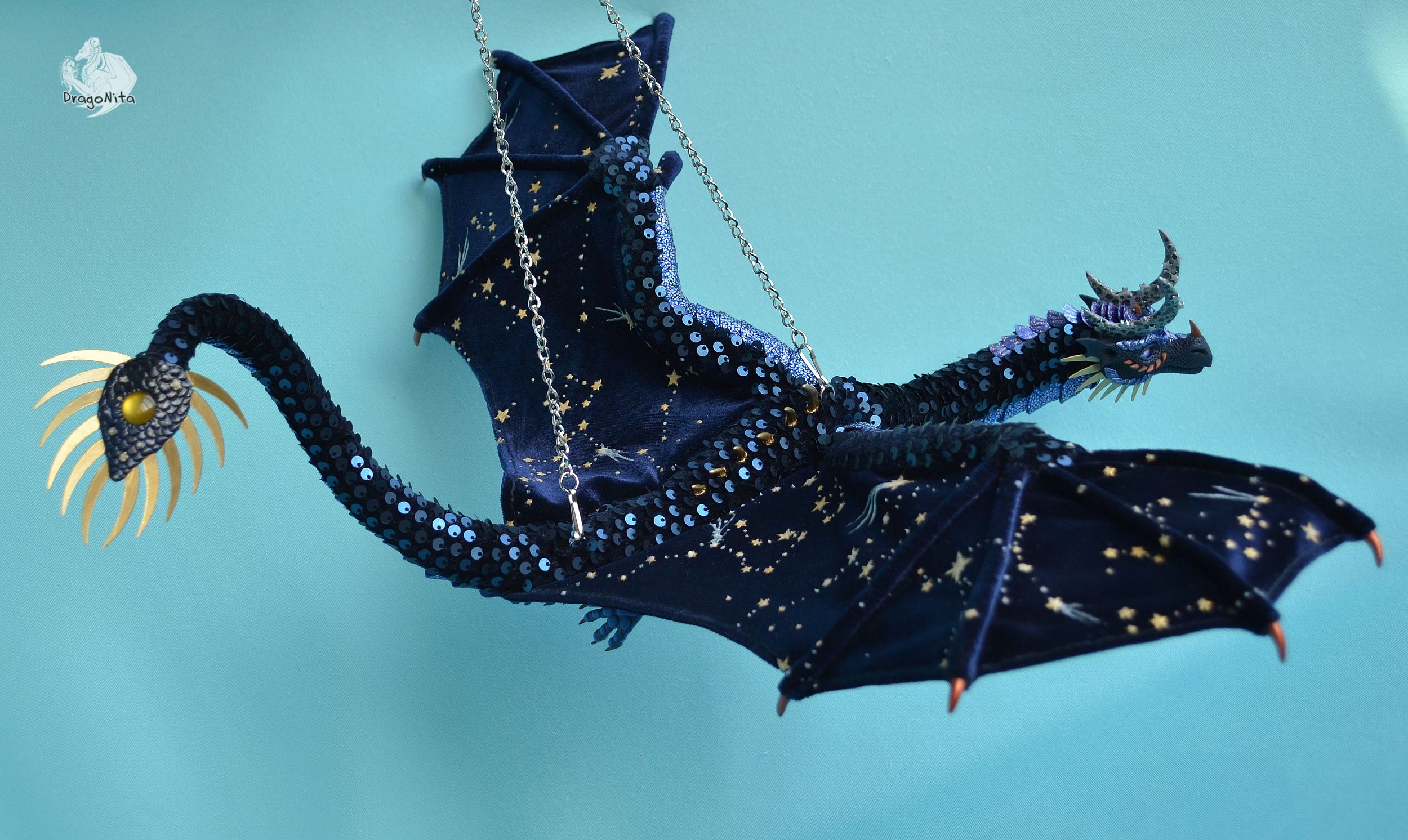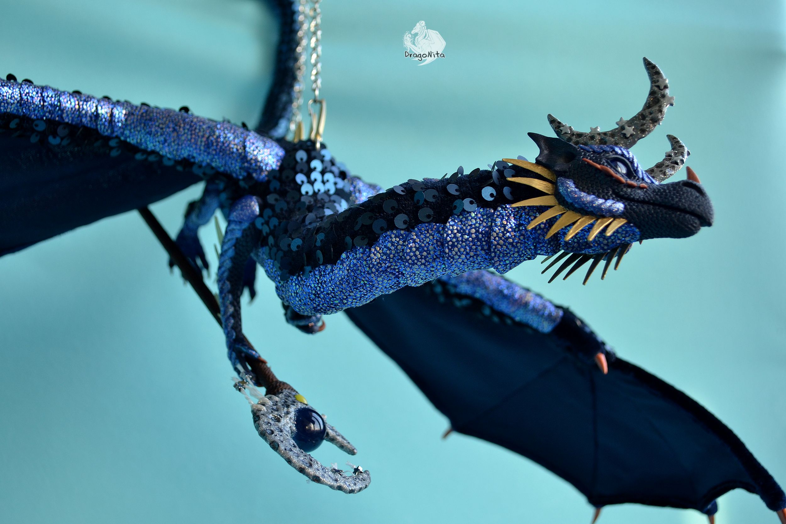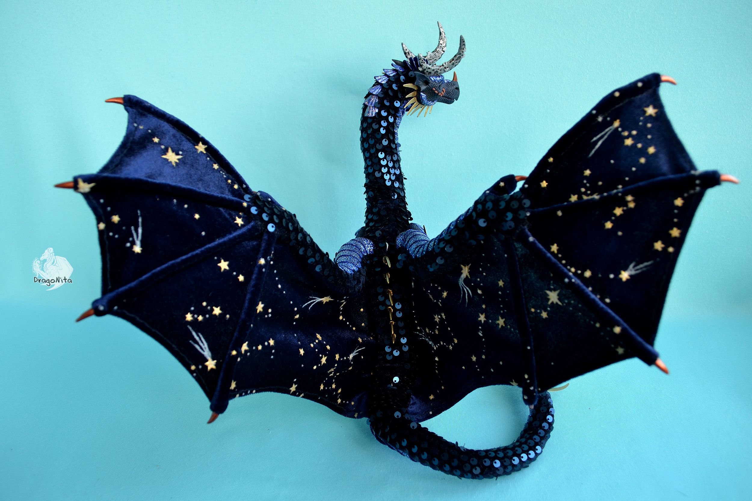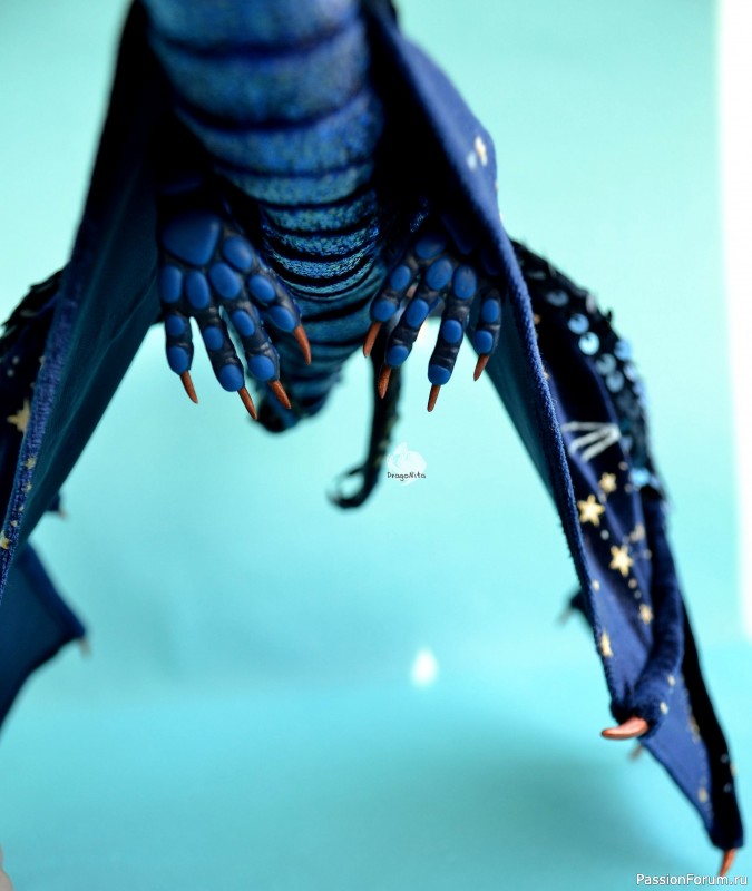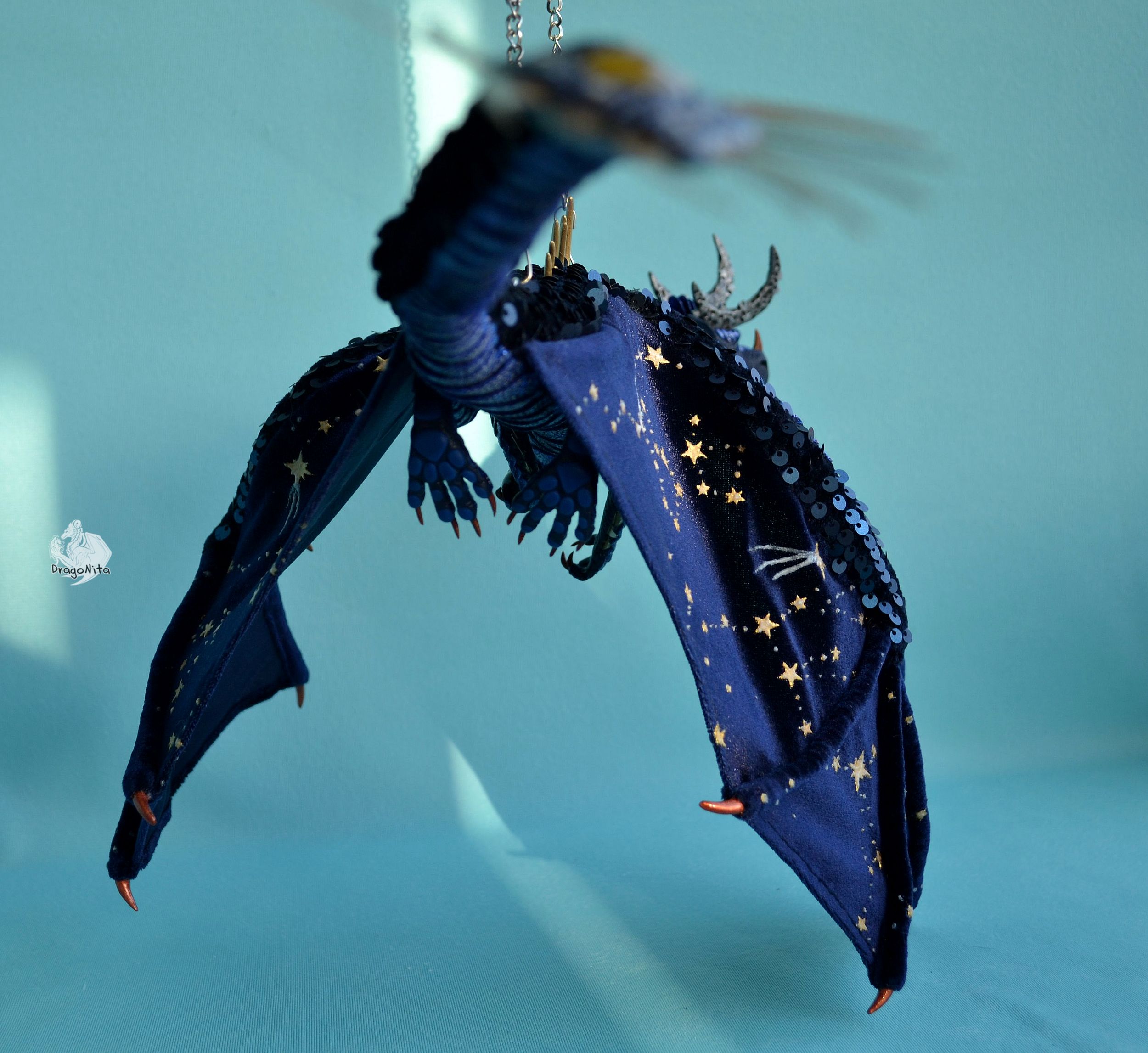 Лапы на нитяном креплении (шёлковые очень прочные нитки). Звёзды на рогах и крыльях ярко светятся в темноте голубым, если подержать дракона под ярким источником света. Крылья складываются и расправляются.