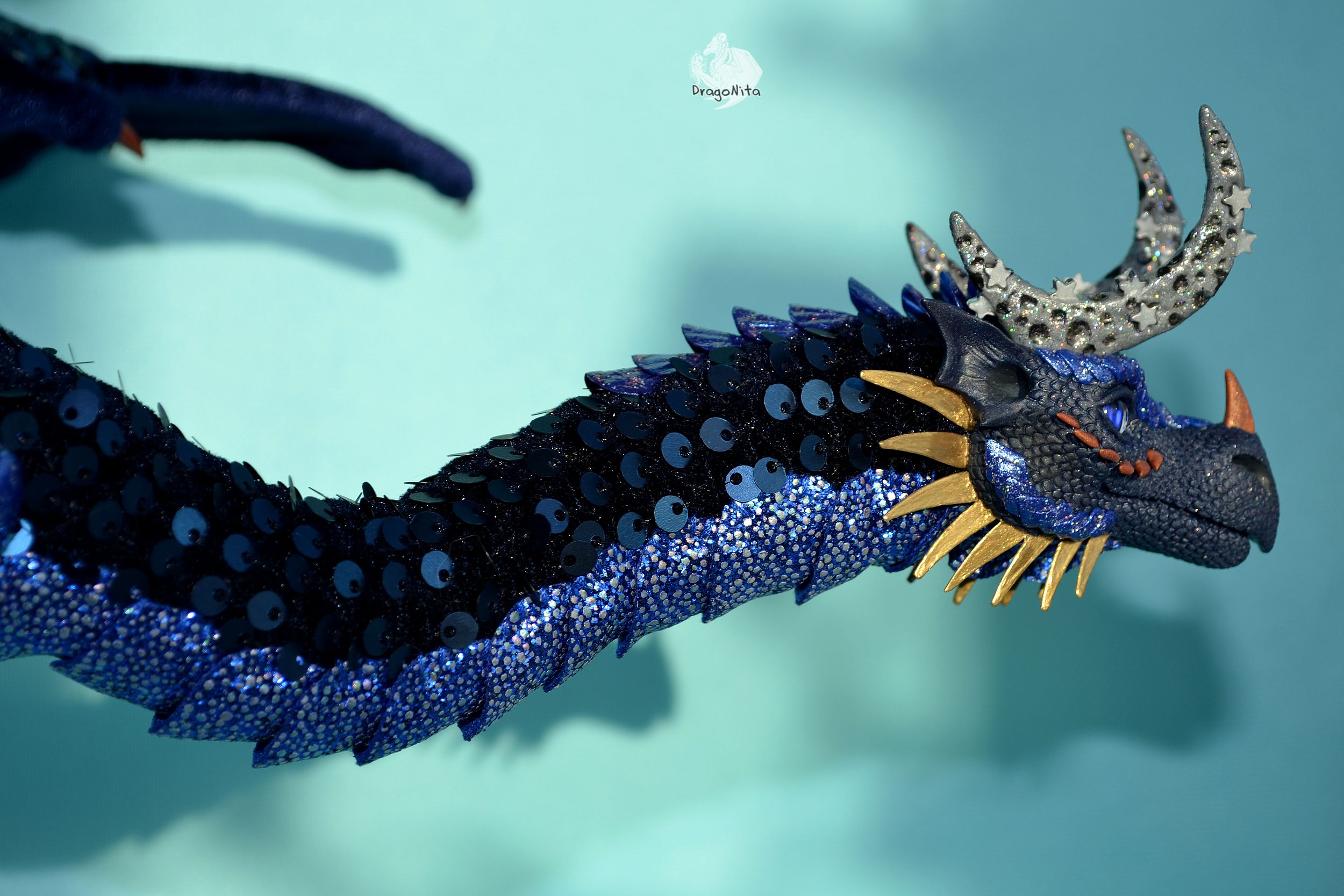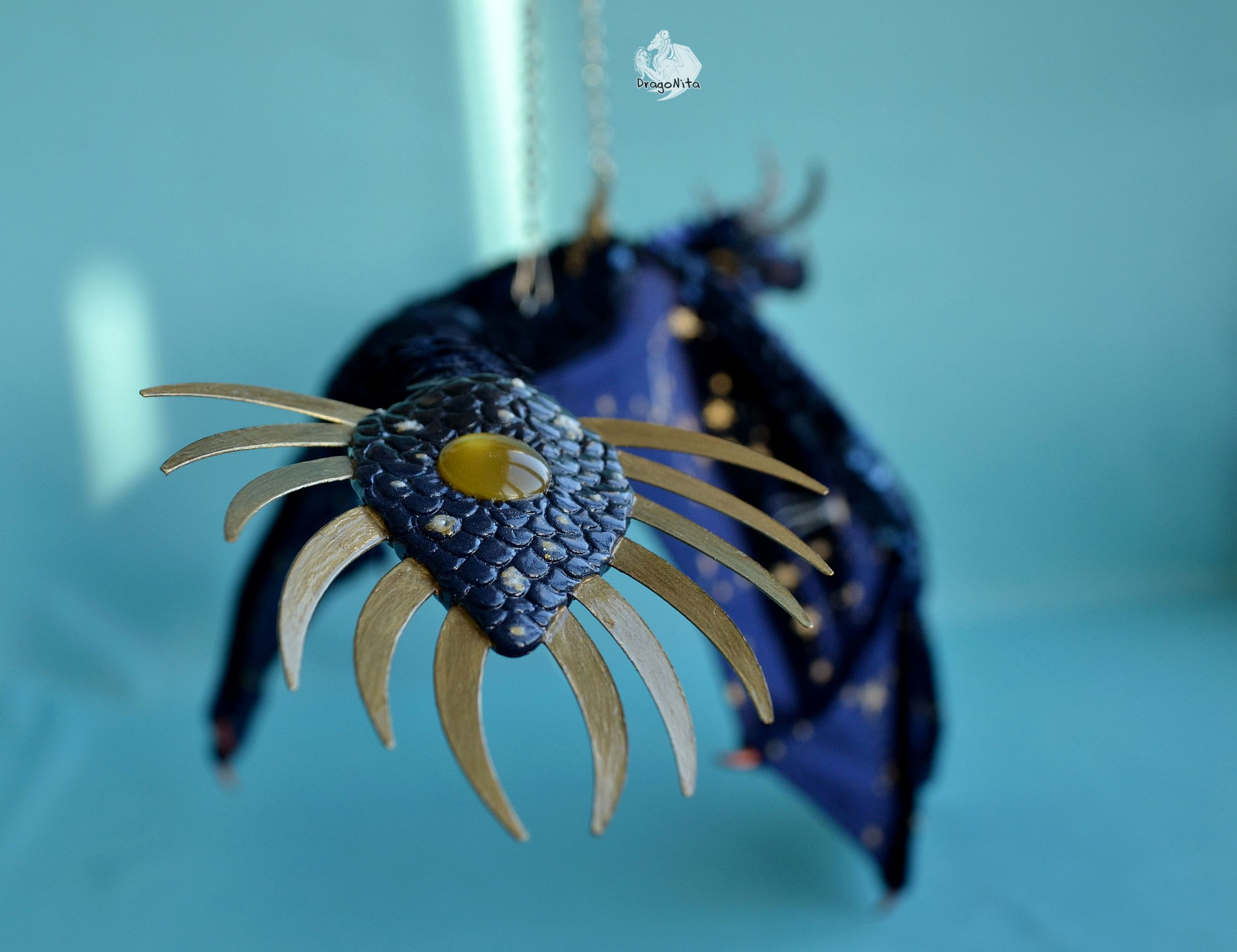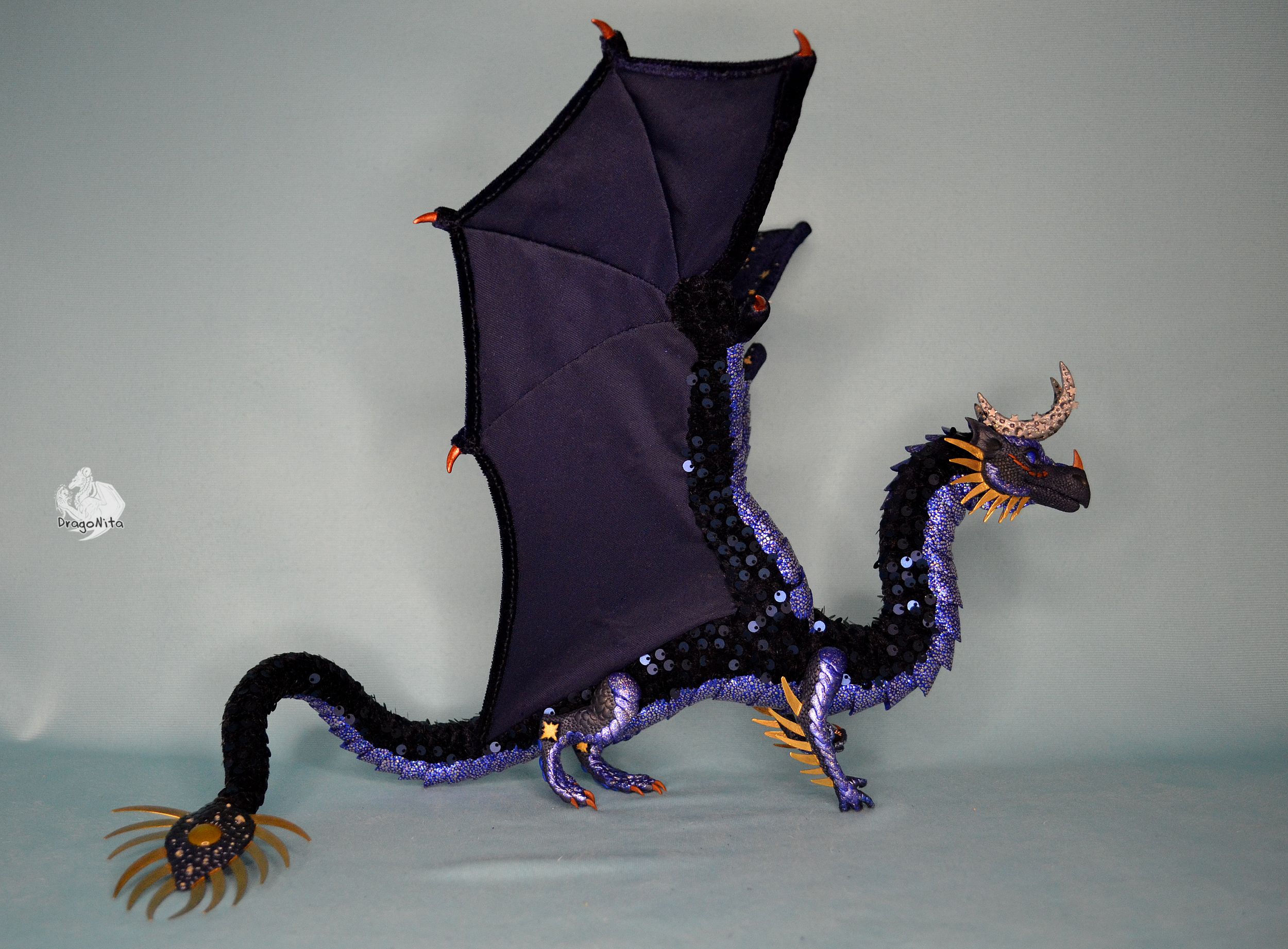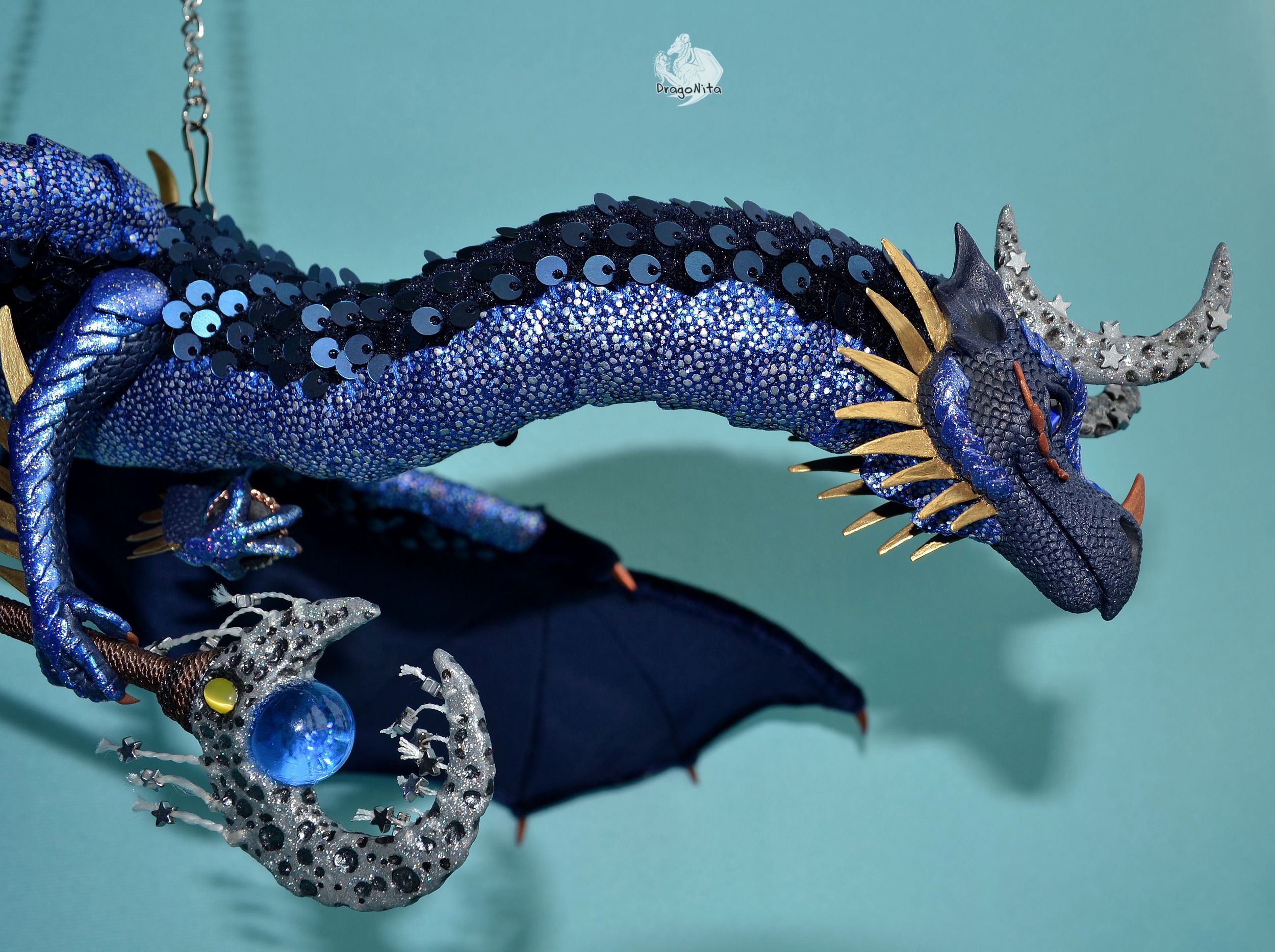 Лапы на нитяном креплении (шёлковые очень прочные нитки). Звёзды на рогах и крыльях ярко светятся в темноте голубым, если подержать дракона под ярким источником света. Крылья складываются и расправляются.