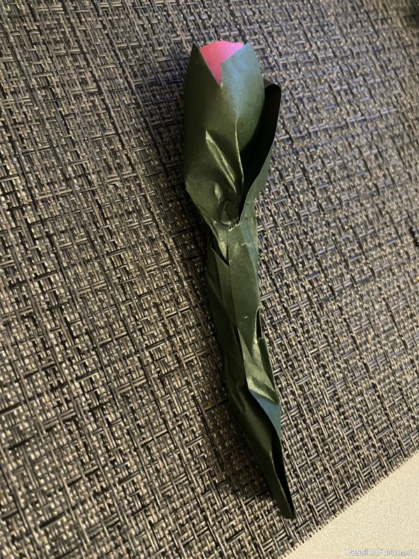 Теперь собираем цветок целиком, закручивая цветок в зеленый листочек. Закручиваем и сминаем для крепости.