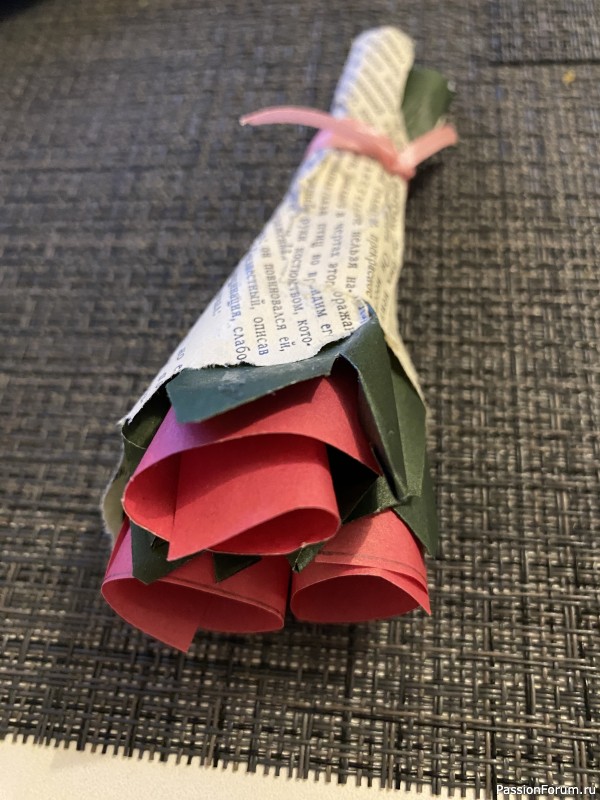 Руками обрываем книжный или другой листочек бумаги. Заворачиваем туда цветы. Можно заклеить уголки и /или завязать ленточкой.