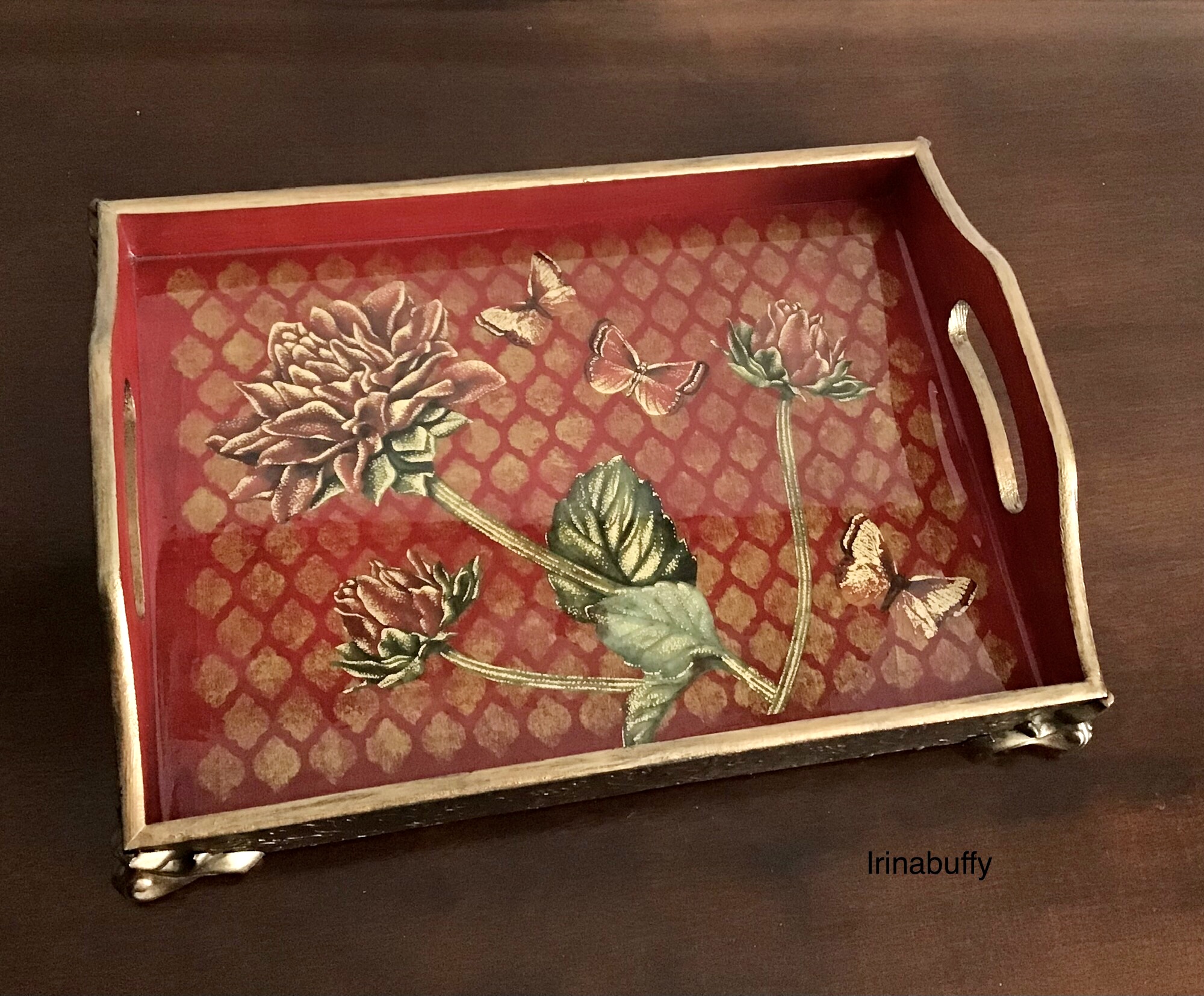Ирочка- шикарно, богато, роскошно получился поднос- глаз не оторвать! Мне понравился этот ненавязчивый трафарет под рисунком, отчего рисунок выглядит художественно элегантно! Ничего лишнего, а боковины еще больше украшают поднос! На шкатулке трафарет получился более ярко, поэтому рисунок не так выразителен, как на подносе. Трафарет на боковинах очень украшает шкатулку, а вот птички затерялись на крышке, слились с золотом на поверхности. Надо было тоже бабочку приклеить вместо них. В общем набор очень понравился, идею с эбоксидкой взяла на заметку- может пригодится. Давно не использовала красный цвет, а зря — потрясающе красивое сочетание!