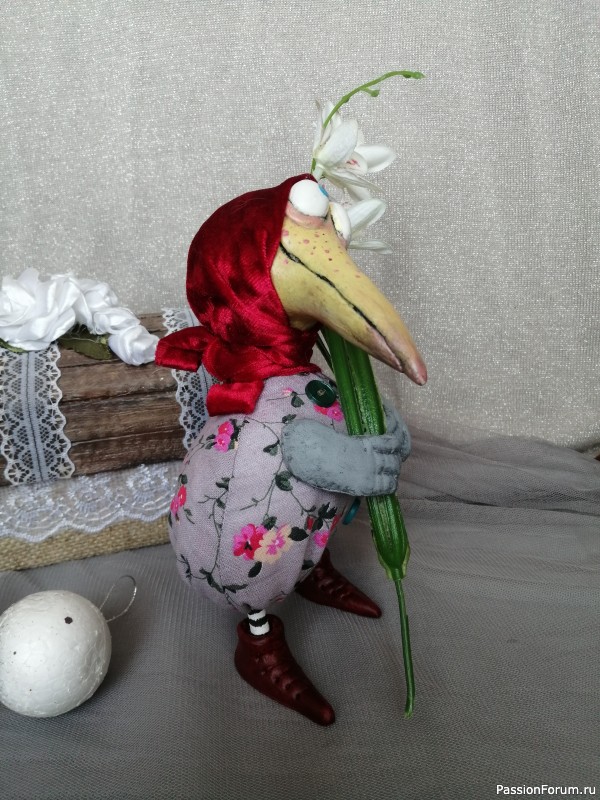 Игрушка выполнена в смешанной технике. Проволочный каркас, тушка из ткани, крылья и хвост грунтованный текстиль, клюв, глаза и сапожки из массы для лепки.